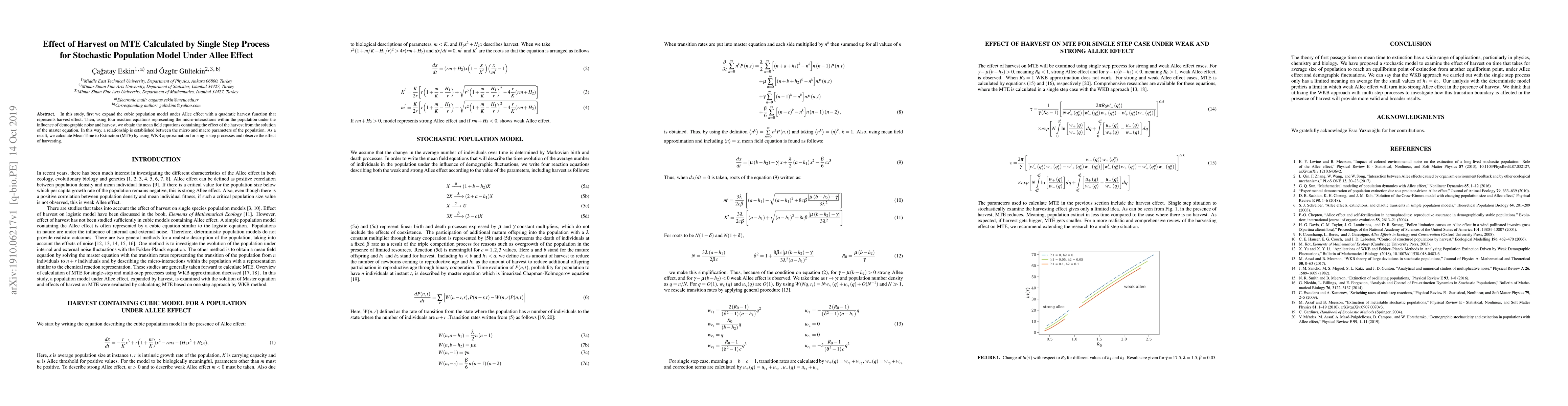 A stochastic model was used to examine the effect of harvest on MTE calculated by single step process for stochastic population model under Allee effect