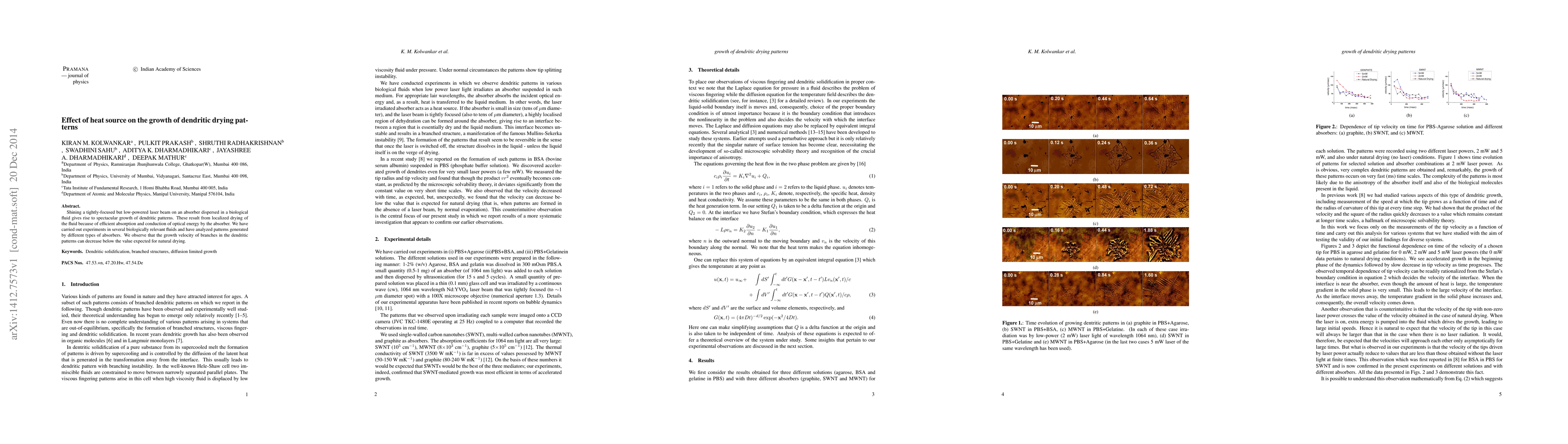 This study investigates the formation of dendritic drying patterns in biological fluids under the influence of a low-powered laser, finding that absorbers efficiently induce localized drying. The research reveals that the growth velocity of dendritic branches can be slower than that of natural drying, indicating a complex interaction between heat source and fluid dynamics.