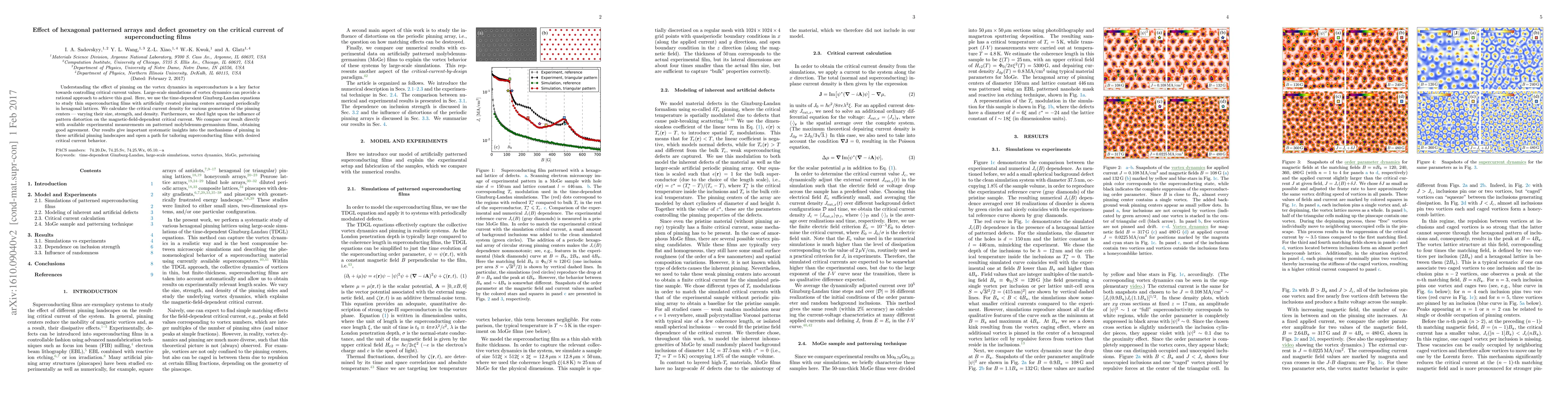 This study investigates how hexagonal patterned arrays and defect geometries affect the critical current density in superconducting films using large-scale simulations based on the time-dependent Ginzburg-Landau equations. The research reveals systematic insights into vortex pinning mechanisms and demonstrates good agreement with experimental measurements on molybdenum-germanium films, providing a pathway for optimizing superconducting films.