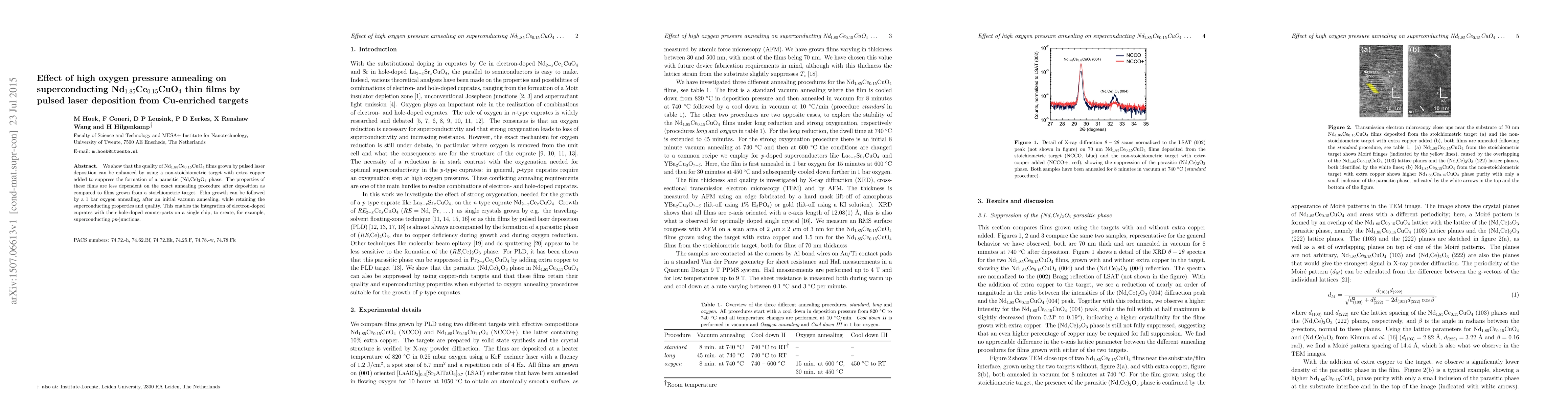 This paper demonstrates that high oxygen pressure annealing enhances the quality of Nd1.85Ce0.15CuO4 thin films grown via pulsed laser deposition from Cu-enriched targets, reducing parasitic phase formation and improving superconducting properties. The films remain high-quality after a 1 bar oxygen annealing following vacuum annealing, facilitating the integration of different superconducting types on a single chip.