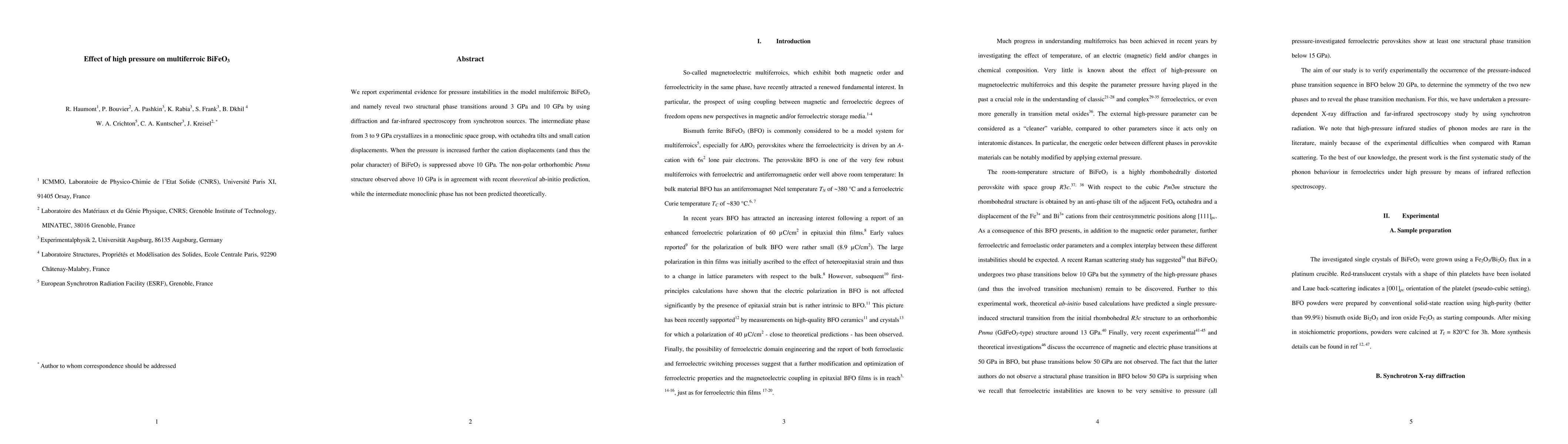 This study reveals two pressure-induced structural phase transitions in multiferroic BiFeO3 at 3 GPa and 10 GPa, with an intermediate monoclinic phase between them and a non-polar orthorhombic phase above 10 GPa, confirming recent theoretical predictions.
