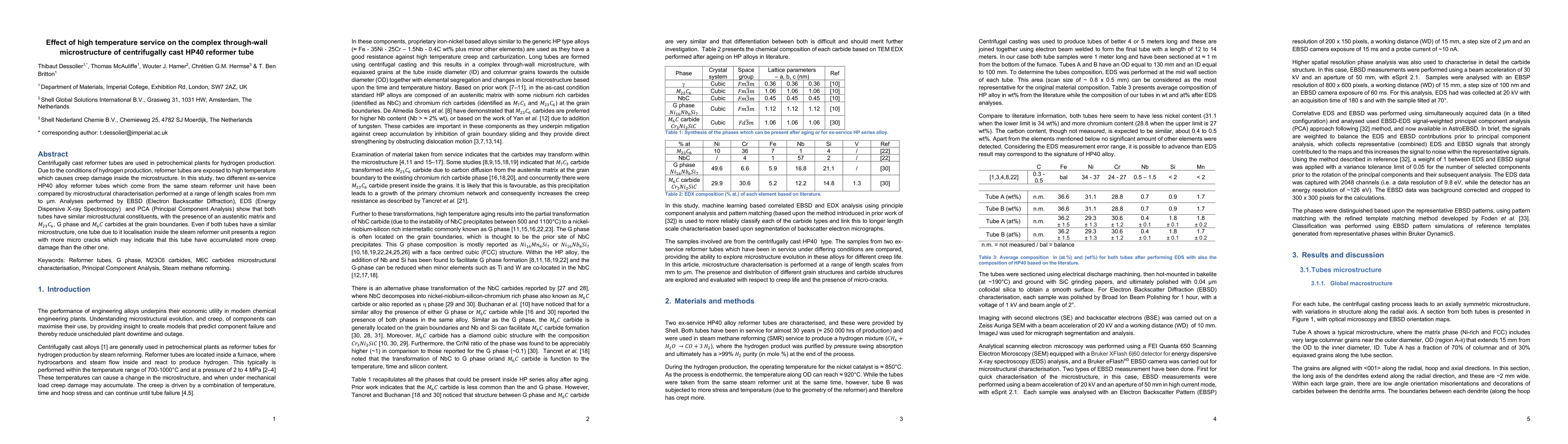 Centrifugally cast reformer tubes are used in petrochemical plants for hydrogen production. Due to the conditions of hydrogen production, reformer tubes are exposed to high temperature which causes creep damage inside the microstructure. In this study, two different ex-service HP40 alloy reformer tubes which come from the same steam reformer unit have been compared by microstructural characterisation performed at a range of length scales from mm to um. Analyses performed by EBSD (Electron Backscatter Diffraction), EDS (Energy Dispersive X-ray Spectroscopy) and PCA (Principal Component Analysis) show that both tubes have similar microstructural constituents, with the presence of an austenitic matrix and M23C6, G phase and M6C carbides at the grain boundaries. Even if both tubes have a similar microstructure, one tube due to it localisation inside the steam reformer unit presents a region with more micro cracks which may indicate that this tube have accumulated more creep damage than the other one.