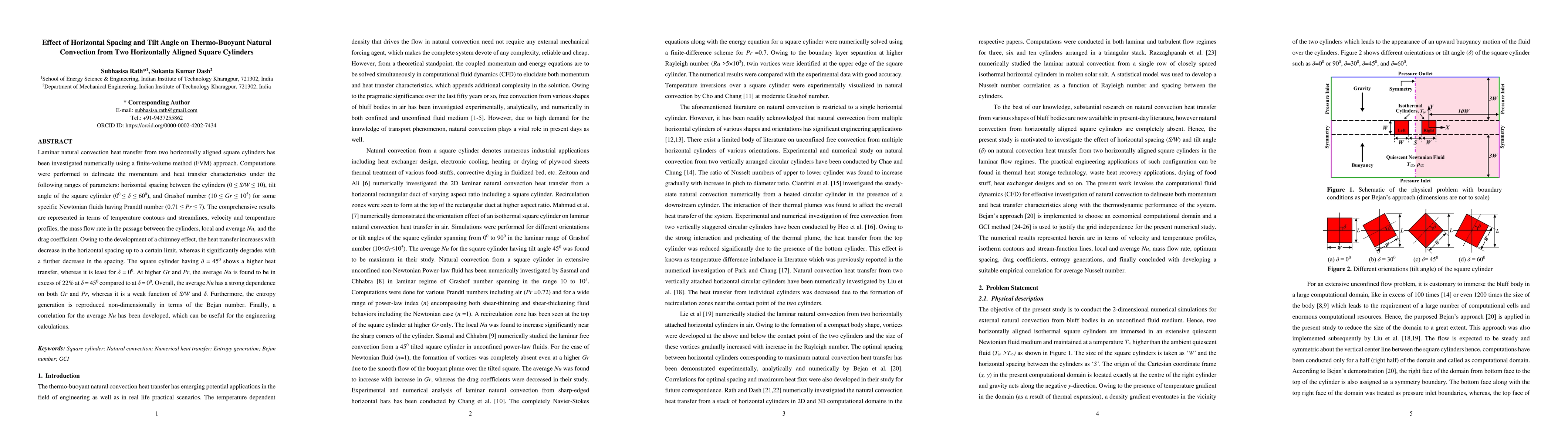 This paper numerically investigates laminar natural convection from two horizontally aligned square cylinders, examining the effects of horizontal spacing and tilt angle on heat transfer. Results show that heat transfer increases with decreasing spacing up to a limit, and is highest for a 45° tilt angle, while average Nu is strongly dependent on Grashof and Prandtl numbers but weakly on spacing and tilt angle.
