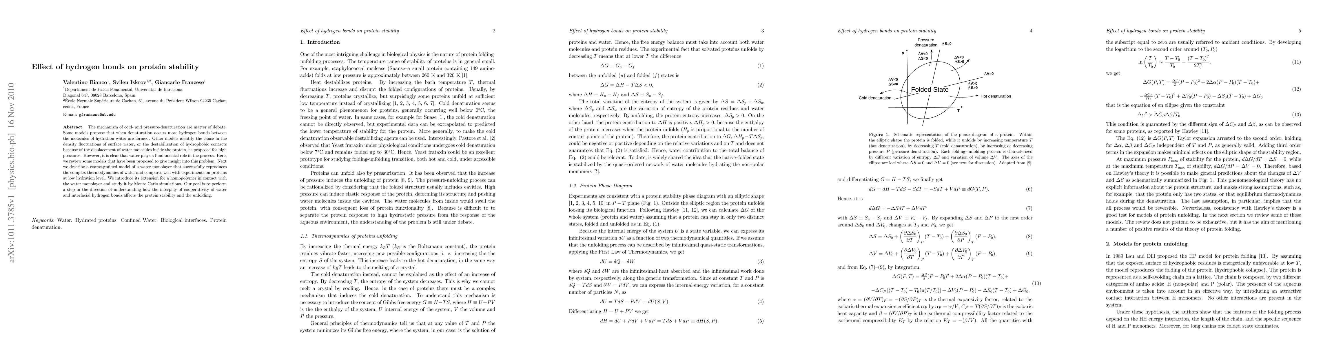 This paper reviews models explaining cold- and pressure-induced protein denaturation, focusing on hydrogen bonds and water's role. It introduces a coarse-grained water model and uses Monte Carlo simulations to explore how water-protein hydrogen bonds influence protein stability and unfolding.