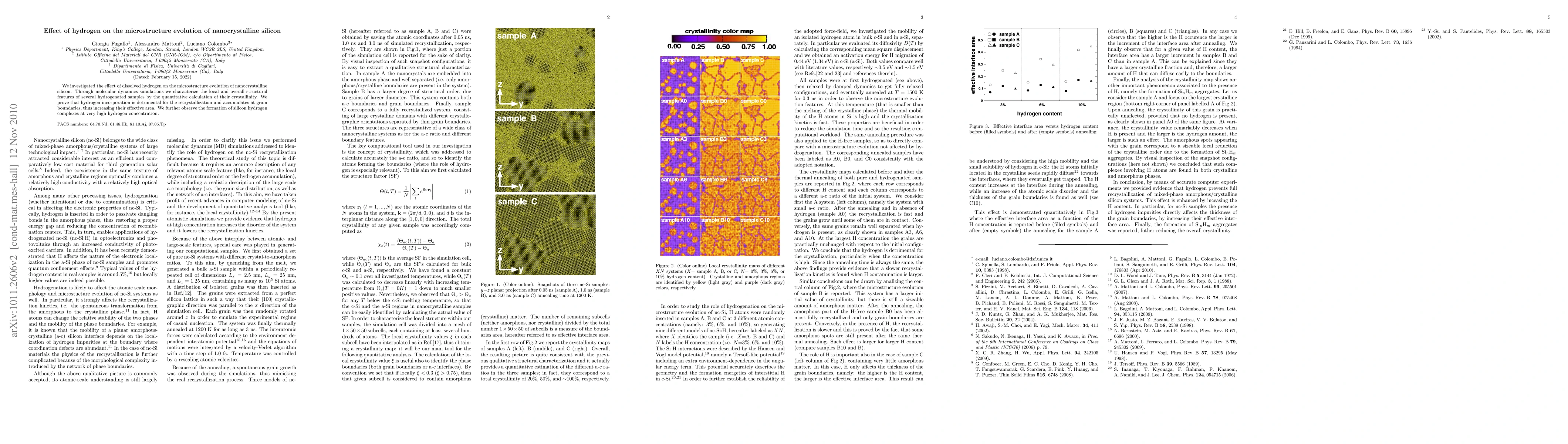 We investigated the effect of dissolved hydrogen on the microstructure evolution of nanocrystalline silicon. Through molecular dynamics simulations we characterize the local and overall structural features of several hydrogenated samples by the quantitative calculation of their crystallinity. We prove that hydrogen incorporation is detrimental for the recrystallization and accumulates at grain boundaries, thus increasing their effective area. We further observe the formation of silicon hydrogen complexes at very high hydrogen concentration.