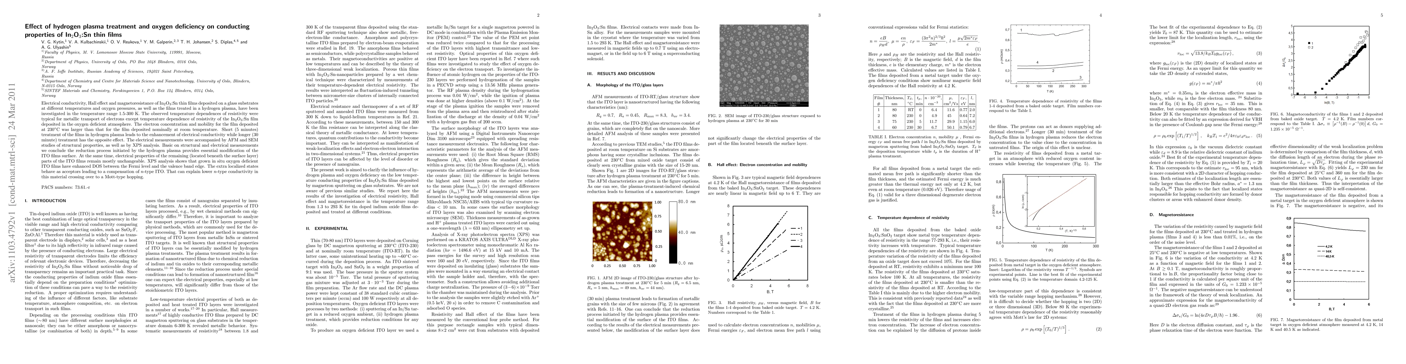 Hydrogen plasma treatment and oxygen deficiency alter In2O3:Sn thin film conductivity, leading to enhanced electrical properties in some cases and reduced conductivity in others.