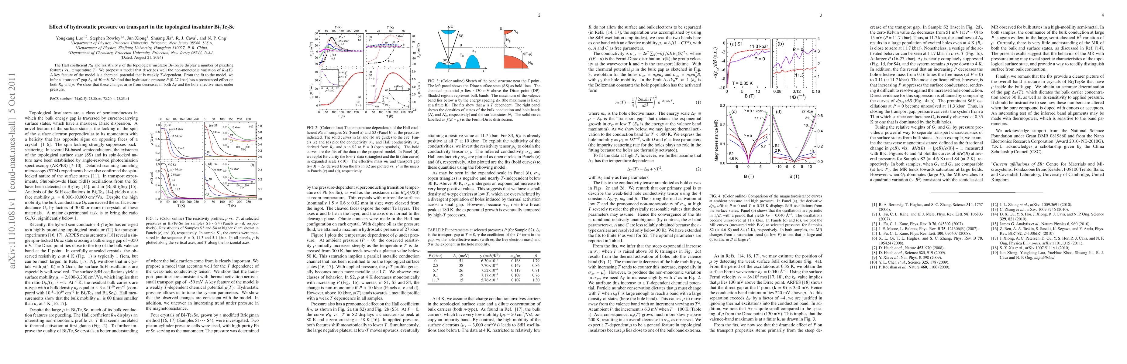 Hydrostatic pressure affects topological insulator Bi$_2$Te$_2$Se by decreasing its transport gap and hole effective mass, leading to changes in Hall coefficient and resistivity with temperature.