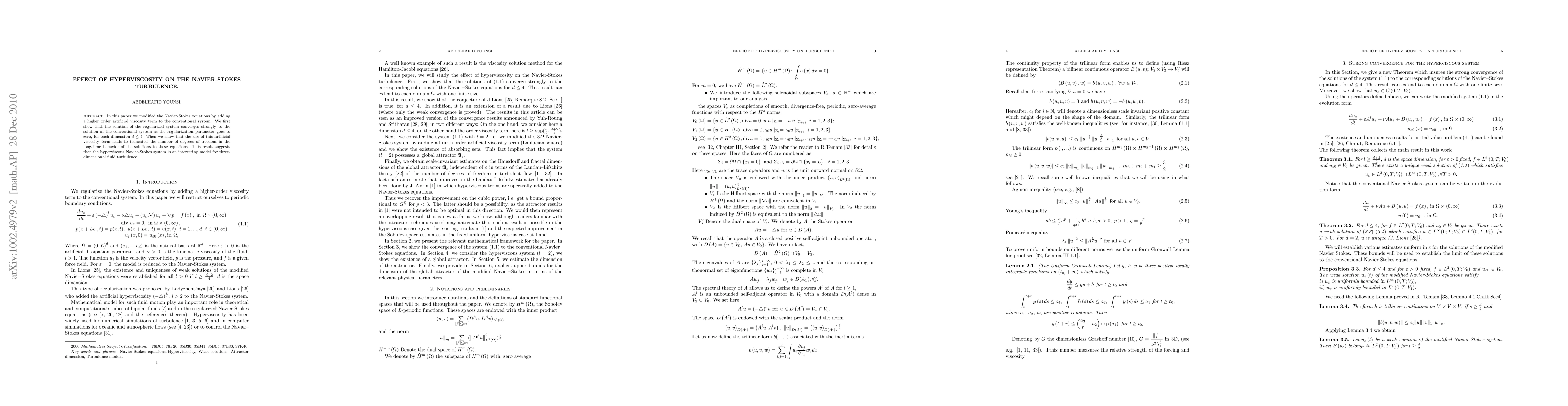In this paper we modified the Navier-Stokes equations by adding a higher order artificial viscosity term to the conventional system. We first show that the solution of the regularized system converges strongly to the solution of the conventional system as the regularization parameter goes to zero, for each dimension d $\le$ 4. Then we show that the use of this artificial viscosity term leads to truncated the number of degrees of freedom in the long-time behavior of the solutions to these equations. This result suggests that the hyperviscous Navier-Stokes system is an interesting model for three-dimensional fluid turbulence.