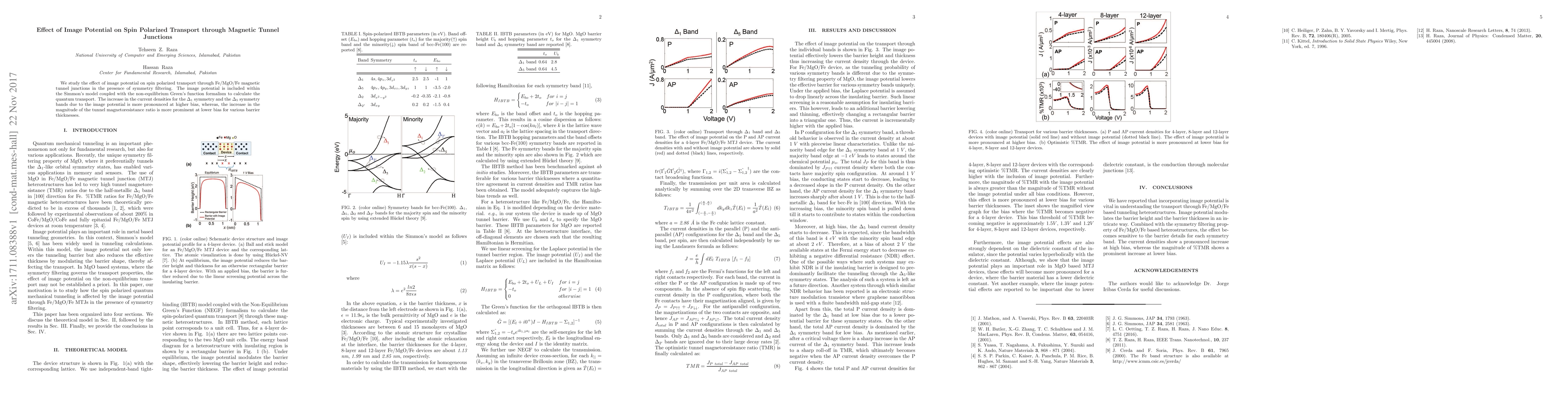 This study investigates how image potential influences spin-polarized transport in Fe/MgO/Fe magnetic tunnel junctions, using a combination of Simmon's model and non-equilibrium Green's function formalism. The results show that image potential enhances current densities for $\Delta_1$ and $\Delta_5$ symmetry bands more significantly at higher biases, while it notably increases the tunnel magnetoresistance ratio at lower biases across different barrier thicknesses.