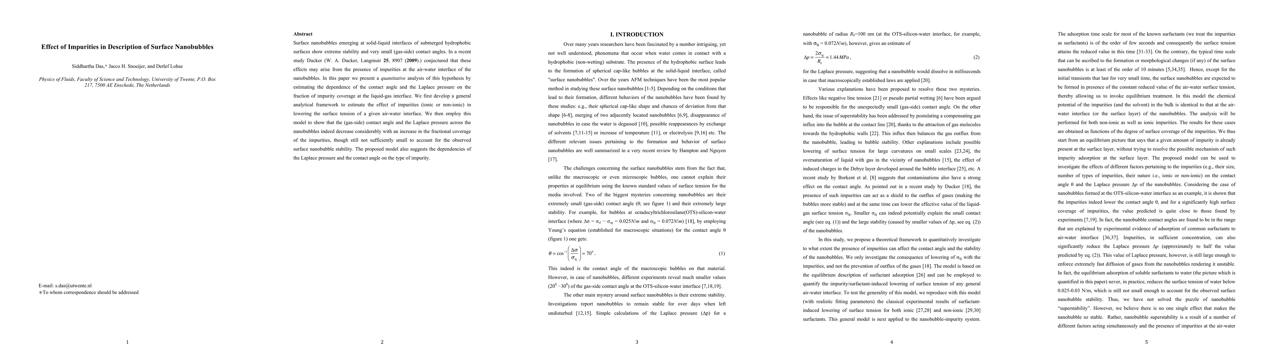 This paper quantitatively analyzes the hypothesis that impurities at the air-water interface reduce surface tension, thereby affecting the stability of surface nanobubbles. The study develops an analytical framework to determine the impact of impurity coverage on contact angle and Laplace pressure, finding that while impurities do lower these values, they are not enough to fully explain the observed stability of nanobubbles.