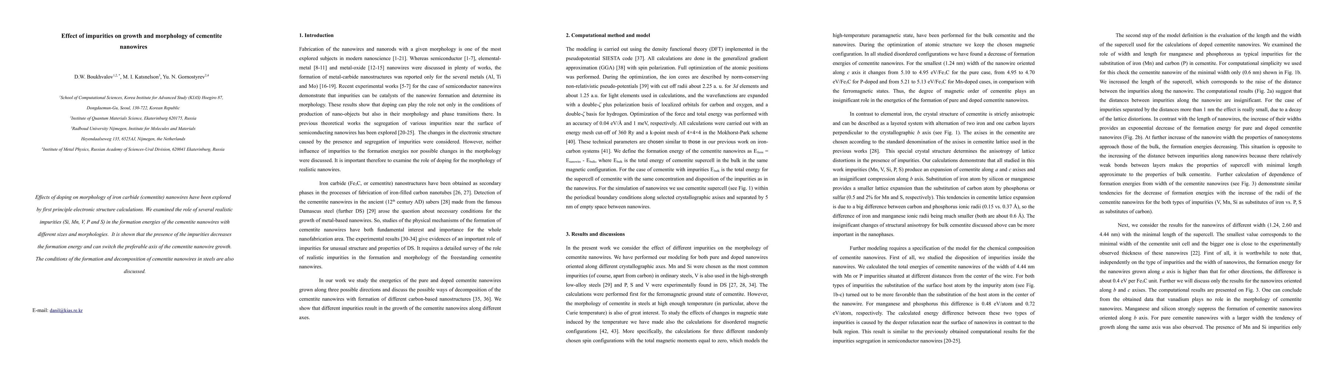This study explores how doping with various impurities (Si, Mn, V, P, and S) affects the growth and morphology of cementite nanowires using first-principle calculations. The presence of these impurities lowers formation energy and can alter the preferred growth axis of the cementite nanowires, with implications for their formation and decomposition in steels.