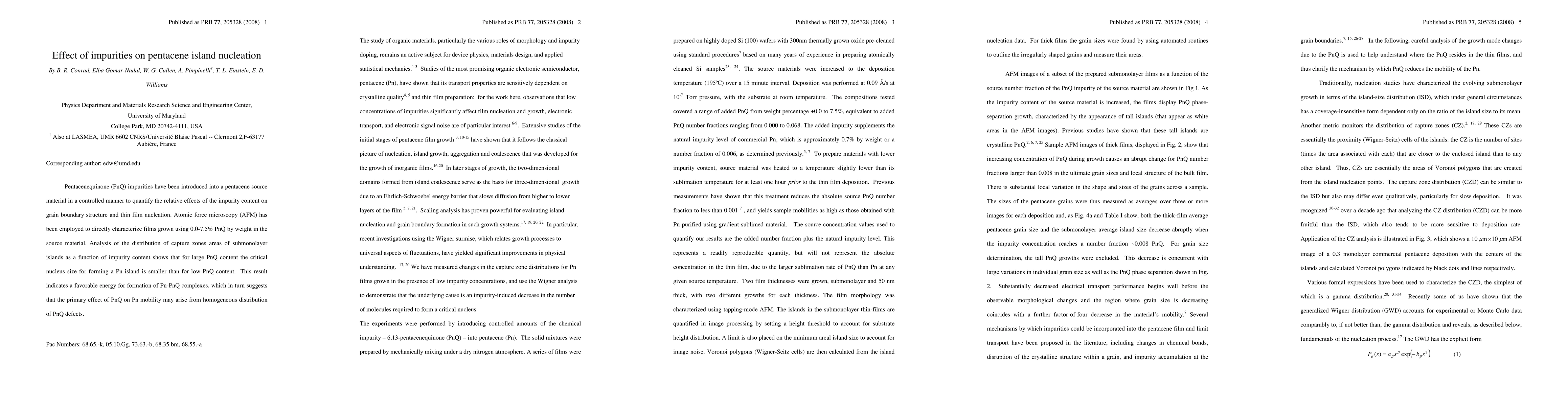 This study investigates how pentacenequinone (PnQ) impurities influence pentacene island nucleation and grain boundary structures. High PnQ content favors smaller critical nucleus sizes, suggesting Pn-PnQ complex formation, which implies PnQ primarily affects pentacene mobility through a homogeneous distribution of defects.