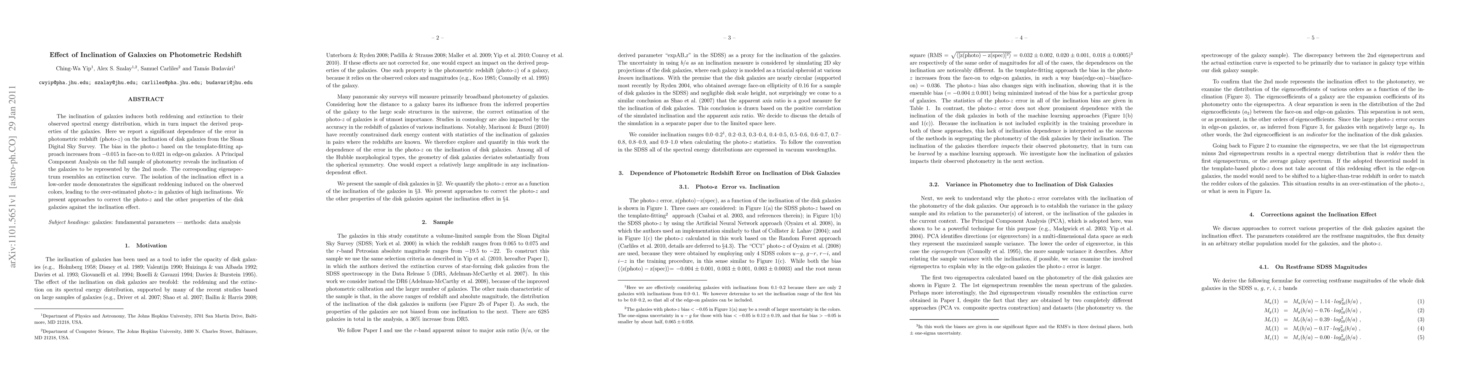 The inclination of galaxies induces both reddening and extinction to their observed spectral energy distribution, which in turn impact the derived properties of the galaxies. Here we report a significant dependence of the error in photometric redshift (photo-z) on the inclination of disk galaxies from the Sloan Digital Sky Survey. The bias in the photo-z based on the template-fitting approach increases from -0.015 in face-on to 0.021 in edge-on galaxies. A Principal Component Analysis on the full sample of photometry reveals the inclination of the galaxies to be represented by the 2nd mode. The corresponding eigenspectrum resembles an extinction curve. The isolation of the inclination effect in a low-order mode demonstrates the significant reddening induced on the observed colors, leading to the over-estimated photo-z in galaxies of high inclinations. We present approaches to correct the photo-z and the other properties of the disk galaxies against the inclination effect.