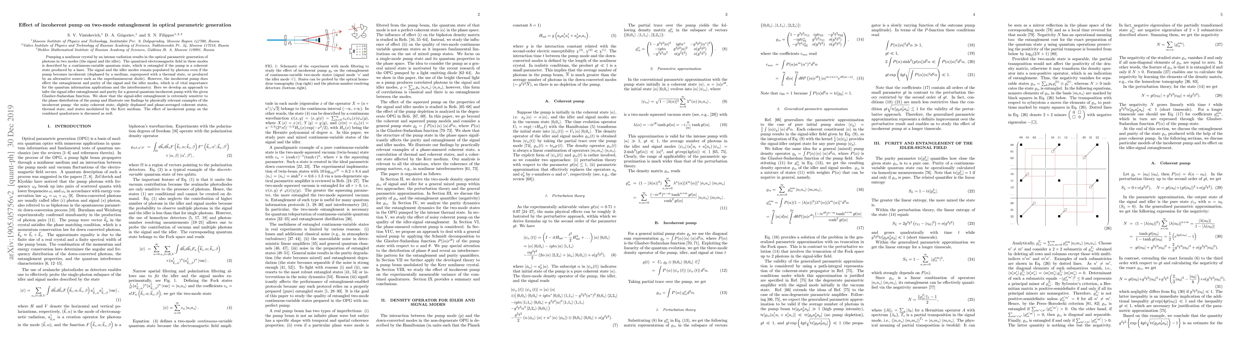 Pumping a nonlinear crystal by an intense radiation results in the optical parametric generation of photons in two modes (the signal and the idler). The quantized electromagnetic field in these modes is described by a continuous-variable quantum state, which is entangled if the pump is a coherent state produced by a laser. The signal and the idler modes remain populated by photons even if the pump becomes incoherent (dephased by a medium, superposed with a thermal state, or produced by an alternative source such as the superluminescent diode). However, the incoherent pump does effect the entanglement and purity of the signal and the idler modes, which is of vital importance for quantum information applications and interferometry. Here we develop an approach to infer the signal-idler entanglement and purity for a general quantum incoherent pump with the given Glauber-Sudarshan function. We show that the signal-idler entanglement is extremely sensitive to the phase distribution of the pump and illustrate our findings by physically relevant examples of the incoherent pump: the noisy coherent state, slightly dephased and phase-averaged coherent states, the thermal state, and states modulated by the Kerr medium. The effect of an incoherent pump on the combined quadratures is discussed as well.