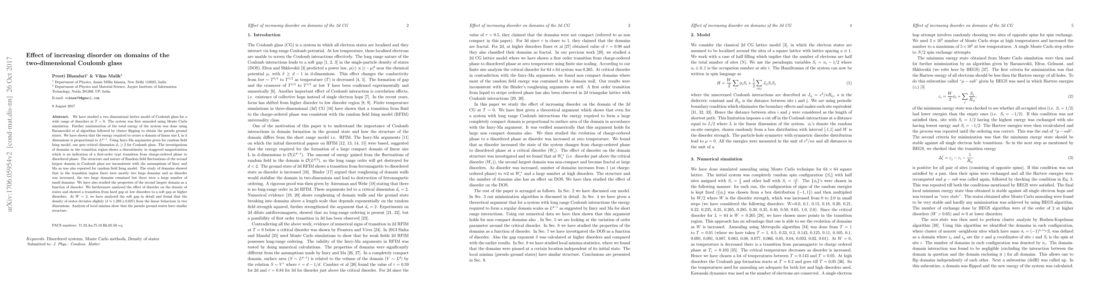 This study investigates the effect of increasing disorder on the domains in a two-dimensional Coulomb glass model, revealing a transition from a charge-ordered phase to a disordered phase marked by a discontinuity in staggered magnetization. The analysis shows a transition from a hard gap to a soft gap in the density of states as disorder increases.