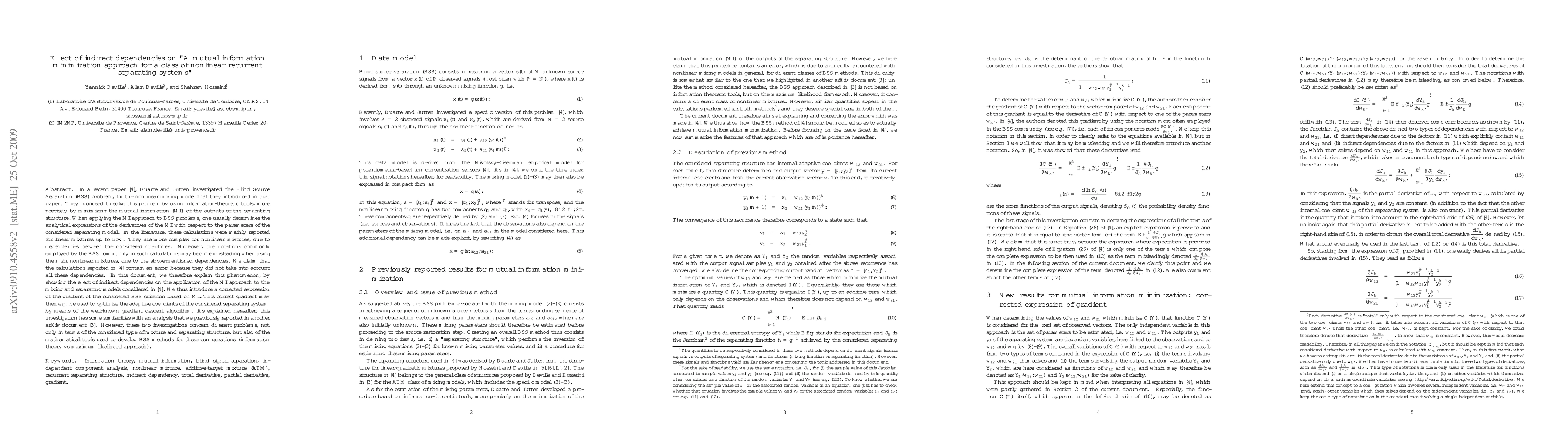 In a recent paper [4], Duarte and Jutten investigated the Blind Source Separation (BSS) problem, for the nonlinear mixing model that they introduced in that paper. They proposed to solve this problem by using information-theoretic tools, more precisely by minimizing the mutual information (MI) of the outputs of the separating structure. When applying the MI approach to BSS problems, one usually determines the analytical expressions of the derivatives of the MI with respect to the parameters of the considered separating model. In the literature, these calculations were mainly reported for linear mixtures up to now. They are more complex for nonlinear mixtures, due to dependencies between the considered quantities. Moreover, the notations commonly employed by the BSS community in such calculations may become misleading when using them for nonlinear mixtures, due to the above-mentioned dependencies. We claim that the calculations reported in [4] contain an error, because they did not take into account all these dependencies. In this document, we therefore explain this phenomenon, by showing the effect of indirect dependencies on the application of the MI approach to the mixing and separating models considered in [4]. We thus introduce a corrected expression of the gradient of the considered BSS criterion based on MI. This correct gradient may then e.g. be used to optimize the adaptive coefficients of the considered separating system by means of the well-known gradient descent algorithm. As explained hereafter, this investigation has some similarities with an analysis that we previously reported in another arXiv document [3]. However, these two investigations concern different problems (mixture and separating structure, mathematical tools: see paper).