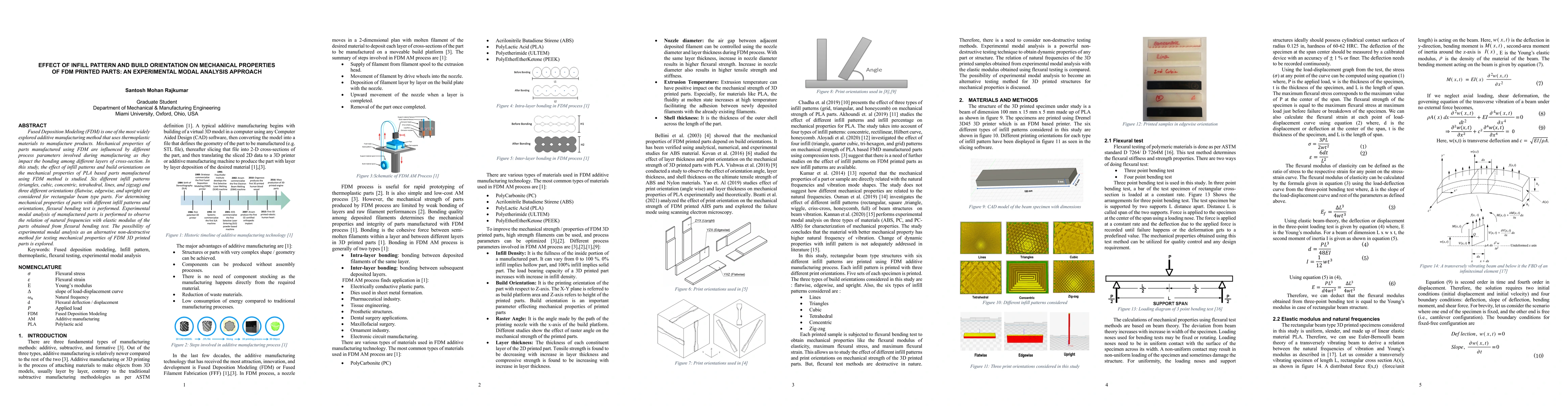 This study investigates the impact of various infill patterns and build orientations on the mechanical properties of PLA parts produced via FDM. Flexural bending tests and experimental modal analysis are used to determine the mechanical properties and assess the feasibility of using modal analysis as a non-destructive testing method.