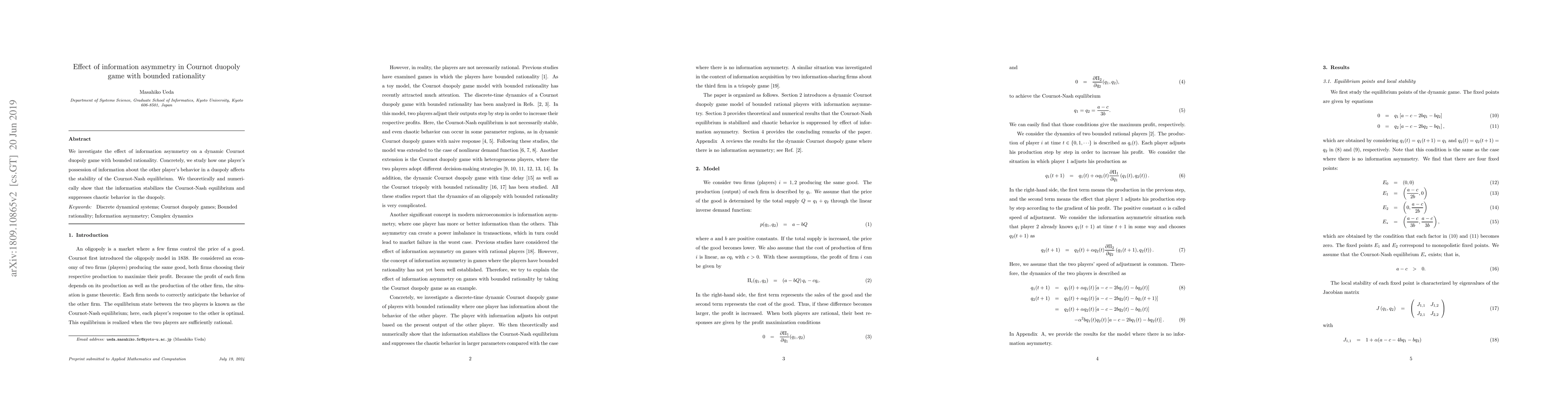 This paper examines how information asymmetry impacts a dynamic Cournot duopoly game where players exhibit bounded rationality. It demonstrates that one player having superior information can stabilize the Cournot-Nash equilibrium and reduce chaotic market behavior.