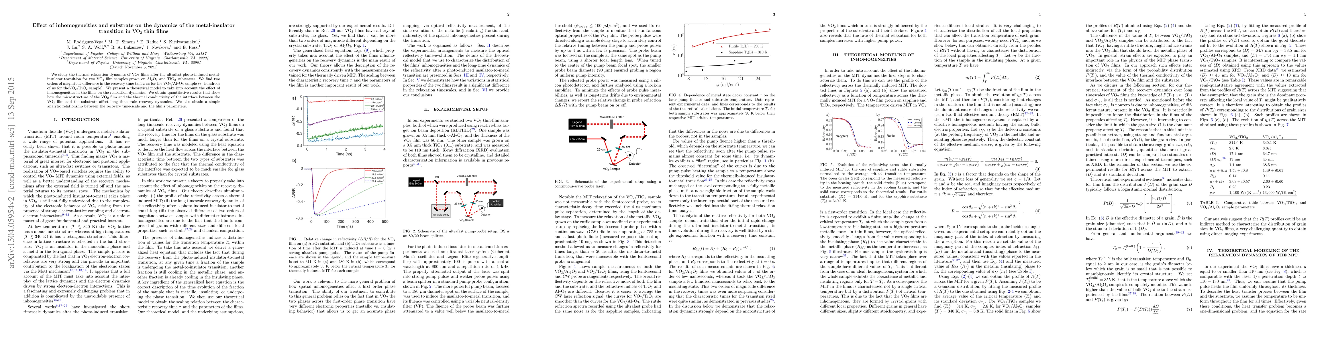 We study the thermal relaxation dynamics of VO$_2$ films after the ultrafast photo-induced metal-insulator transition for two VO$_2$ film samples grown on Al$_2$O$_3$ and TiO$_2$ substrates. We find two orders of magnitude difference in the recovery time (a few ns for the VO$_2$/Al$_2$O$_3$ sample vs. hundreds of ns for the VO$_2$/TiO$_2$ sample). We present a theoretical model that accurately describes the MIT thermal properties and interpret the experimental measurements. We obtain quantitative results that show how the microstructure of the VO$_2$ film and the thermal conductivity of the interface between the VO$_2$ film and the substrate affect long time-scale recovery dynamics. We also obtain a simple analytic relationship between the recovery time-scale and some of the film parameters.
