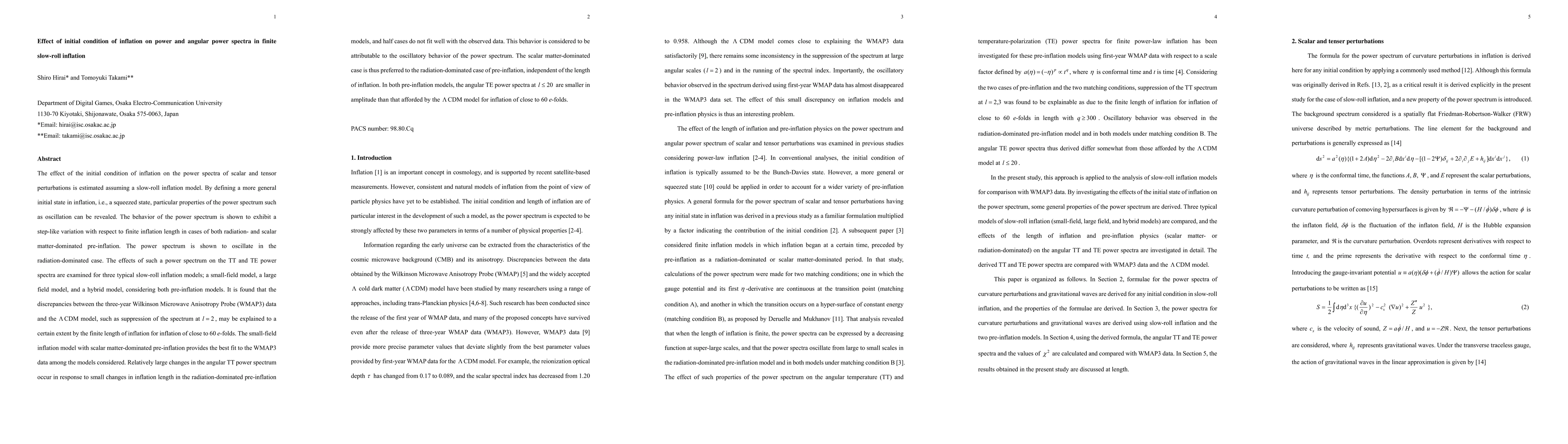 This paper investigates how initial inflationary conditions affect the power and angular power spectra in finite slow-roll inflation, revealing step-like variations and oscillations in the spectra. It finds that scalar matter-dominated pre-inflation, particularly in small-field models, provides a better fit to WMAP3 data compared to radiation-dominated pre-inflation, which shows large angular TT power spectrum changes due to oscillatory behavior.