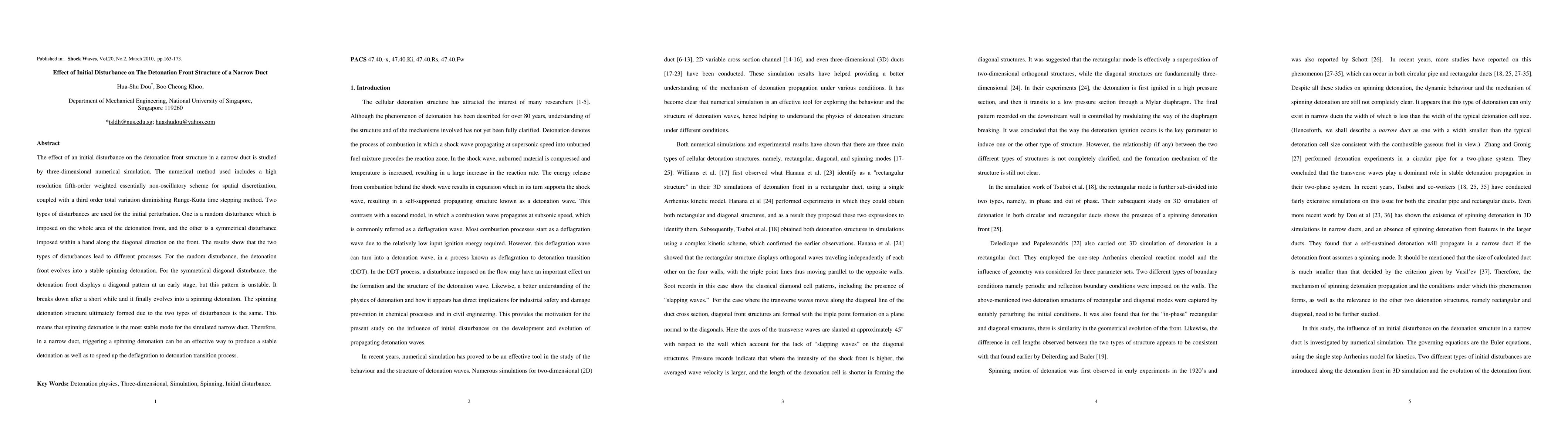This study uses high-resolution numerical simulations to investigate how initial disturbances affect the detonation front structure in a narrow duct. The results indicate that random and diagonal disturbances both lead to a stable spinning detonation, suggesting that spinning detonation is the most stable mode in such ducts.