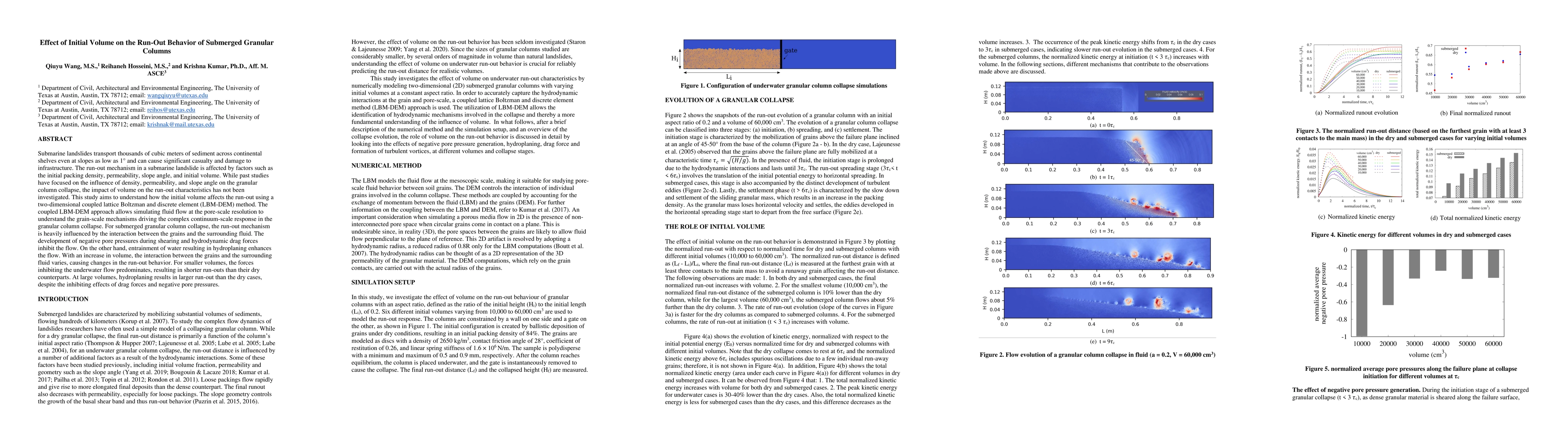 This study investigates the effect of initial volume on the run-out behavior of submerged granular columns using a coupled LBM-DEM method. It finds that larger volumes lead to enhanced run-out due to hydroplaning, despite drag forces and negative pore pressures that inhibit flow in smaller volumes.