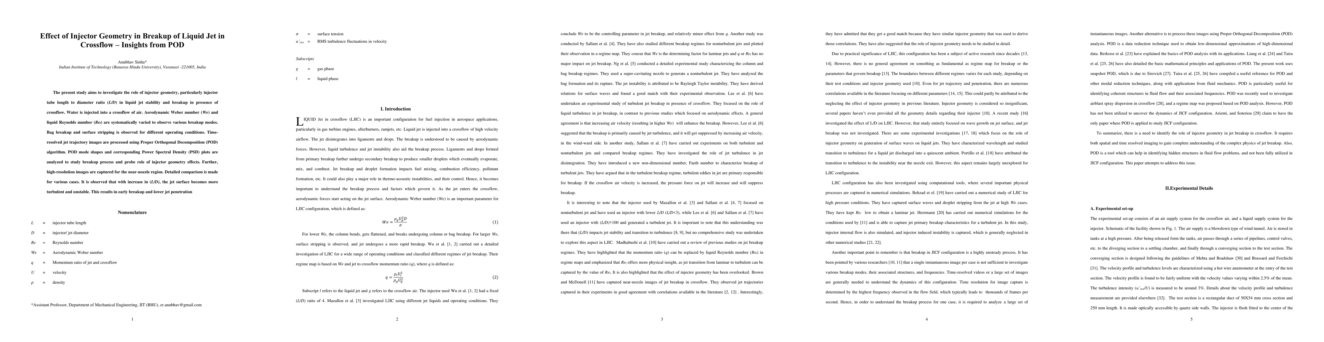 The present study aims to investigate the role of injector geometry, particularly injector tube length to diameter ratio (L/D) in liquid jet stability and breakup in presence of crossflow. Water is injected into a crossflow of air. Aerodynamic Weber number (We) and liquid Reynolds number (Rel) are systematically varied to observe various breakup modes. Bag breakup and surface stripping is observed for different operating conditions. Time-resolved jet trajectory images are processed using Proper Orthogonal Decomposition (POD) algorithm. POD mode shapes and corresponding Power Spectral Density (PSD) plots are analyzed to study breakup process and probe role of injector geometry effects. Further, high-resolution images are captured for the near-nozzle region. Detailed comparison is made for various cases. It is observed that with increase in (L/D), the jet surface becomes more turbulent and unstable. This results in early breakup and lower jet penetration