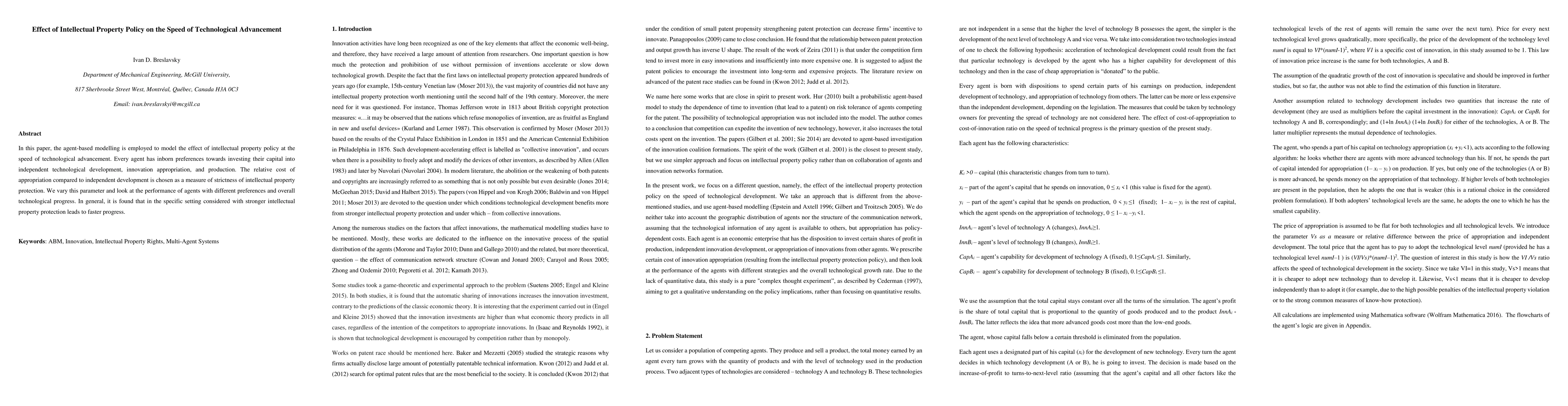 This paper uses agent-based modeling to investigate how intellectual property policy affects technological advancement speed. It finds that stronger intellectual property protection generally leads to faster technological progress, depending on agents' investment preferences in innovation and production.