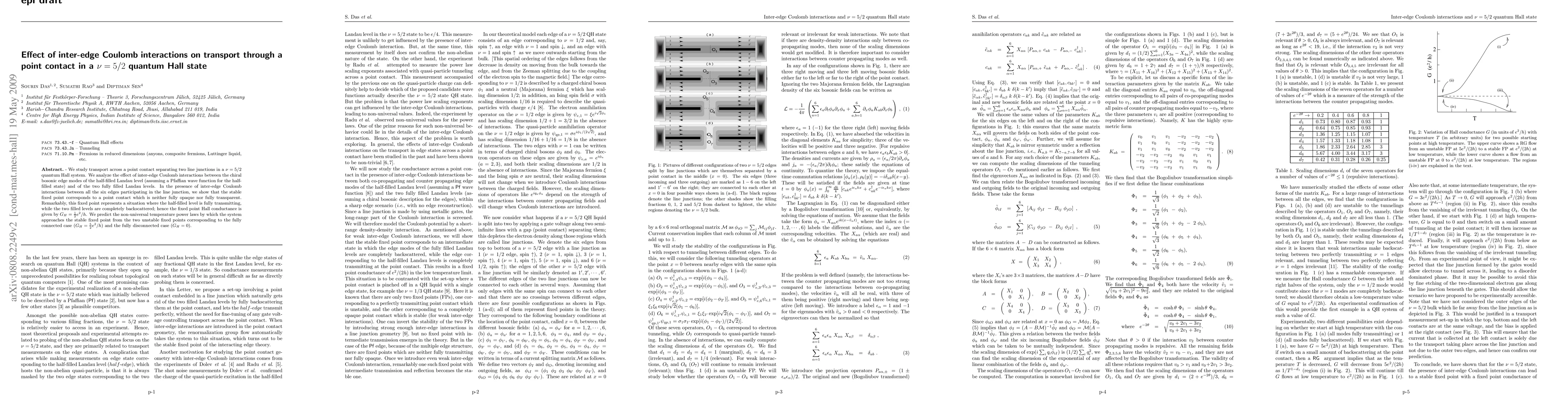 This paper investigates transport through a point contact in a ν = 5/2 quantum Hall state, focusing on inter-edge Coulomb interactions. It finds that these interactions lead to a stable fixed point where the half-filled level is fully transmitting, while the filled levels are backscattered, resulting in a Hall conductance of G_H = 1/2 e^2/h.