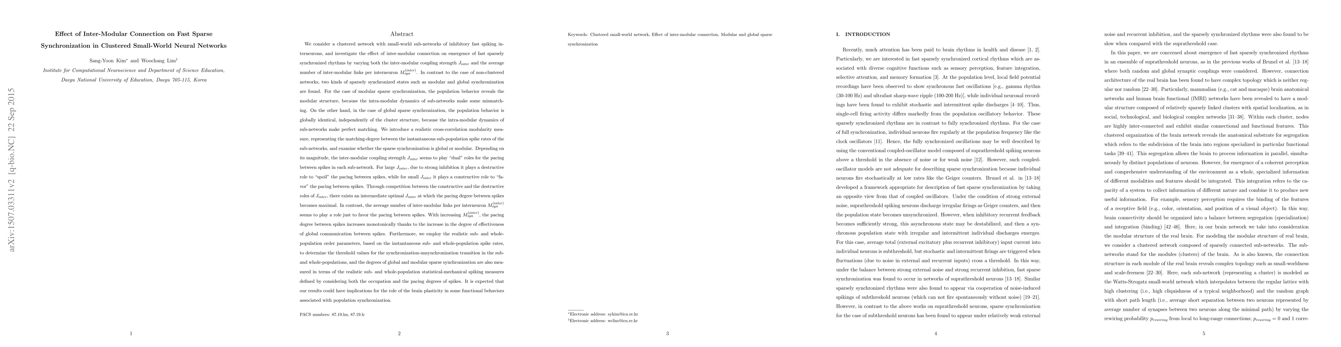 This paper investigates the impact of inter-modular connections on fast sparse synchronization in clustered small-world neural networks, revealing two types of synchronization: modular and global. The study finds that inter-modular coupling strength and the number of inter-modular links influence whether synchronization is modular or global, with strong inhibition disrupting synchronization while increased inter-modular links enhance it.