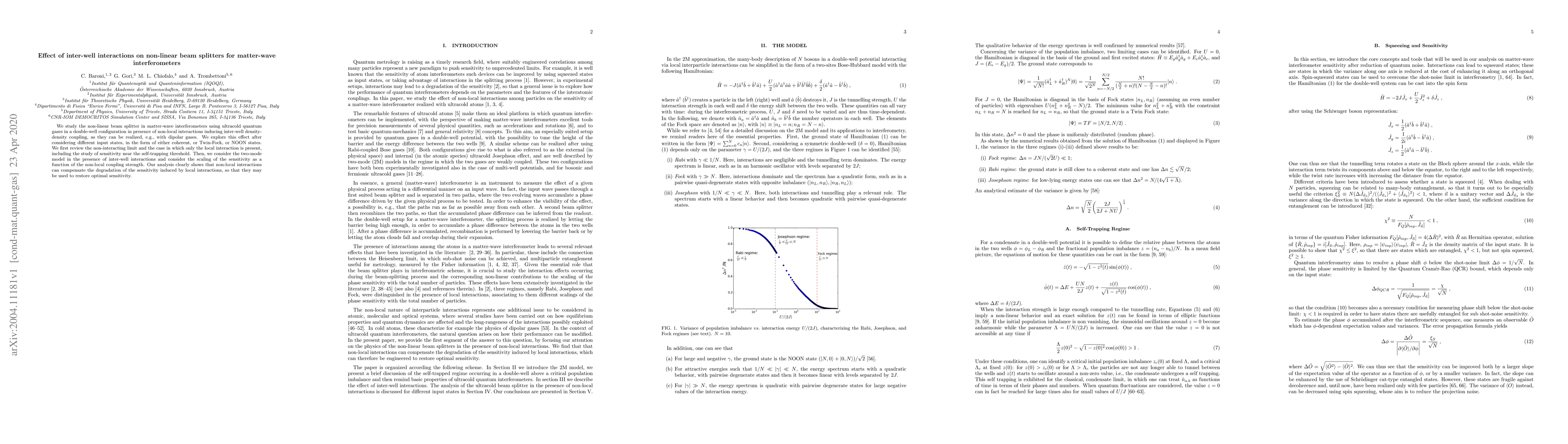We study the non-linear beam splitter in matter-wave interferometers using ultracold quantum gases in a double-well configuration in presence of non-local interactions inducing inter-well density-density coupling, as they can be realized, e.g., with dipolar gases. We explore this effect after considering different input states, in the form of either coherent, or Twin-Fock, or NOON states. We first review the non-interacting limit and the case in which only the local interaction is present, including the study of sensitivity near the self-trapping threshold. Then, we consider the two-mode model in the presence of inter-well interactions and consider the scaling of the sensitivity as a function of the non-local coupling strength. Our analysis clearly shows that non-local interactions can compensate the degradation of the sensitivity induced by local interactions, so that they may be used to restore optimal sensitivity.