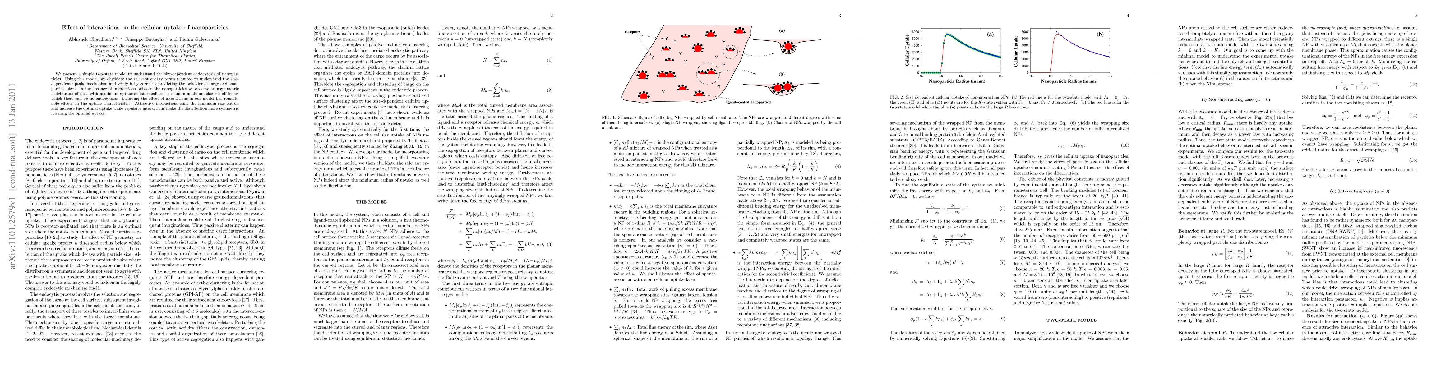 We present a simple two-state model to understand the size-dependent endocytosis of nanoparticles. Using this model, we elucidate the relevant energy terms required to understand the size-dependent uptake mechanism and verify it by correctly predicting the behavior at large and small particle sizes. In the absence of interactions between the nanoparticles we observe an asymmetric distribution of sizes with maximum uptake at intermediate sizes and a minimum size cut-off below which there can be no endocytosis. Including the effect of interactions in our model has remarkable effects on the uptake characteristics. Attractive interactions shift the minimum size cut-off and increase the optimal uptake while repulsive interactions make the distribution more symmetric lowering the optimal uptake.