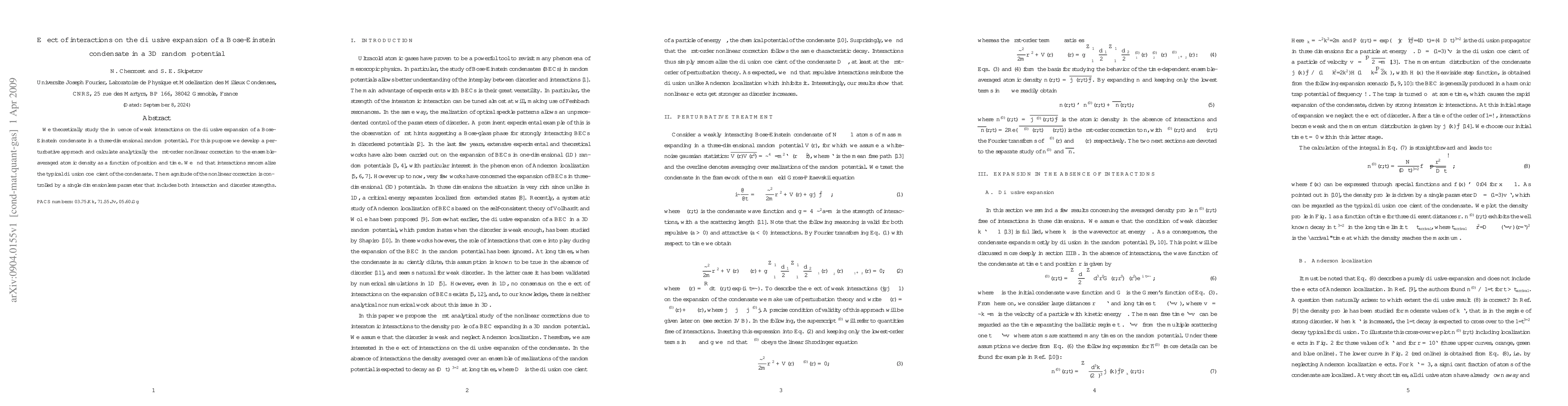 This research investigates how weak interactions affect the diffusive expansion of a Bose-Einstein condensate in a 3D random potential, finding that interactions renormalize the diffusion coefficient, with the correction magnitude governed by a dimensionless parameter reflecting both interaction and disorder strengths.