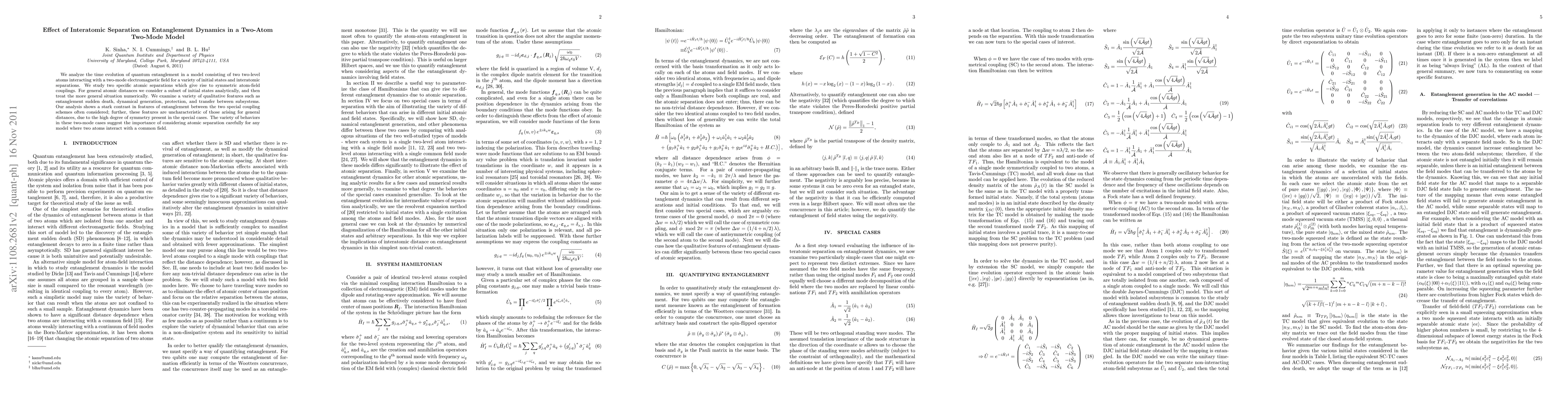 We analyze the time evolution of quantum entanglement in a model consisting of two two-level atoms interacting with a two-mode electromagnetic field for a variety of initial states and interatomic separations. We study two specific atomic separations which give rise to symmetric atom-field couplings. For general atomic distances we consider a subset of initial states analytically, and then treat the more general situation numerically. We examine a variety of qualitative features such as entanglement sudden death, dynamical generation, protection, and transfer between subsystems. Our analysis shows a stark contrast in features of entanglement between the two special coupling schemes often considered; further, these features are uncharacteristic of those arising for general distances, due to the high degree of symmetry present in the special cases. The variety of behaviors in these two-mode cases suggest the importance of considering atomic separation carefully for any model where two atoms interact with a common field.