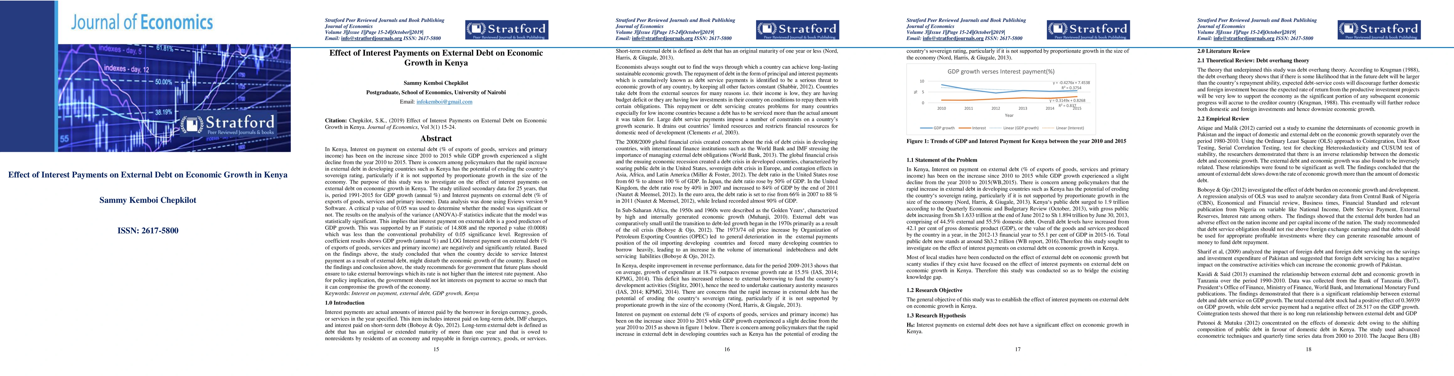In Kenya, interest payments on external debt have been increasing from 2010 to 2015, while GDP growth experienced a slight decline over the same period. Policymakers are concerned that the rapid increase in external debt in developing countries such as Kenya has the potential to erode the country's sovereign rating, particularly if it is not supported by proportionate growth in the size of the economy. The purpose of this study was to investigate the effect of interest payments on external debt on economic growth in Kenya. The study utilized secondary data for 25 years, from 1991 to 2015, for GDP growth and interest payments on external debt. The results from the analysis of variance statistics indicate that the model was statistically significant. This implies that interest payments on external debt are good predictors of GDP growth. Regression coefficient results show that GDP growth and the logarithm of interest payments on external debt are negatively and significantly related. The study recommends that future government plans should ensure that external borrowings are taken at rates not higher than the interest rate payments.