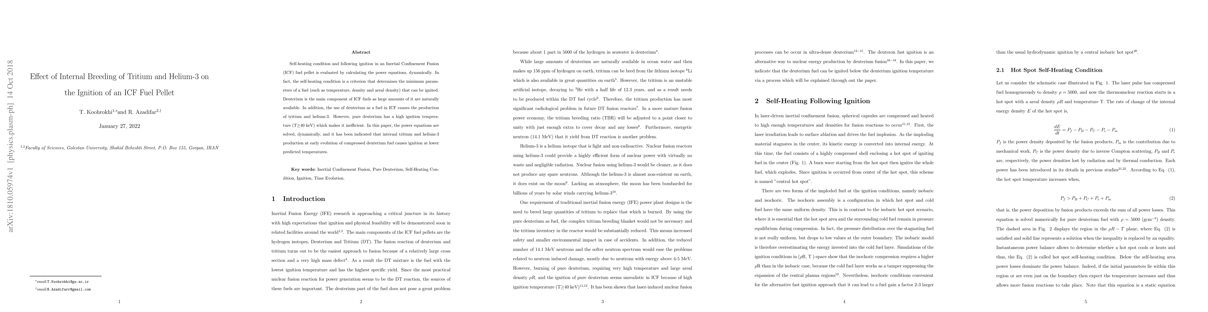 This paper evaluates the ignition of an Inertial Confinement Fusion (ICF) fuel pellet by solving power equations dynamically, showing that internal breeding of tritium and helium-3 can lower ignition temperatures, improving efficiency compared to using pure deuterium.