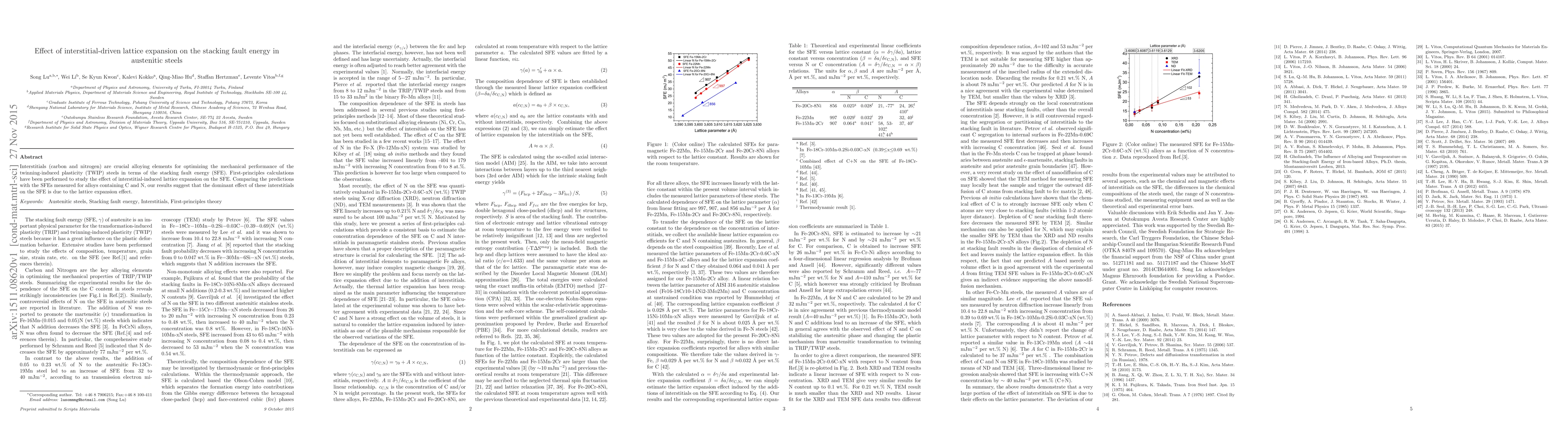 This study uses first-principles calculations to investigate how interstitial carbon and nitrogen atoms expand the lattice and affect the stacking fault energy (SFE) in austenitic TWIP steels. The findings indicate that the primary influence of interstitials on SFE is due to lattice expansion, corroborated by comparisons with experimental SFE measurements.