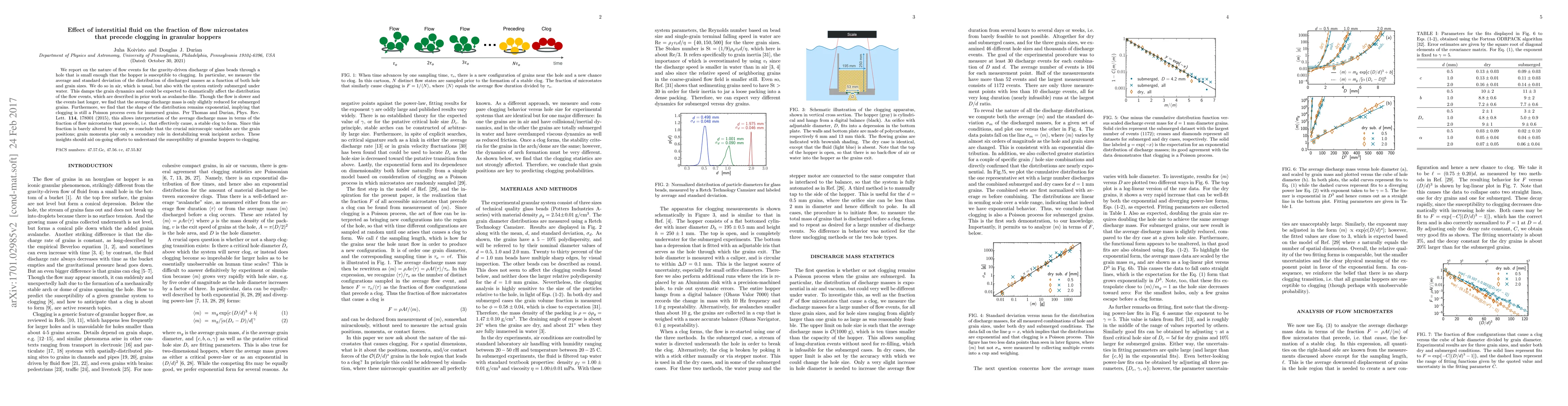 We report on the nature of flow events for the gravity-driven discharge of glass beads through a hole that is small enough that the hopper is susceptible to clogging. In particular, we measure the average and standard deviation of the distribution of discharged masses as a function of both hole and grain sizes. We do so in air, which is usual, but also with the system entirely submerged under water. This damps the grain dynamics and could be expected to dramatically affect the distribution of the flow events, which are described in prior work as avalanche-like. Though the flow is slower and the events last longer, we find that the average discharge mass is only slightly reduced for submerged grains. Furthermore, we find that the shape of the distribution remains exponential, implying that clogging is still a Poisson process even for immersed grains. Per Thomas and Durian [Phys. Rev. Lett. 114, 178001 (2015]), this allows interpretation of the average discharge mass in terms of the fraction of flow microstates that precede, i.e. that effectively cause, a stable clog to form. Since this fraction is barely altered by water, we conclude that the crucial microscopic variables are the grain positions; grain momenta play only a secondary role in destabilizing weak incipient arches. These insights should aid on-going efforts to understand the susceptibility of granular hoppers to clogging.
