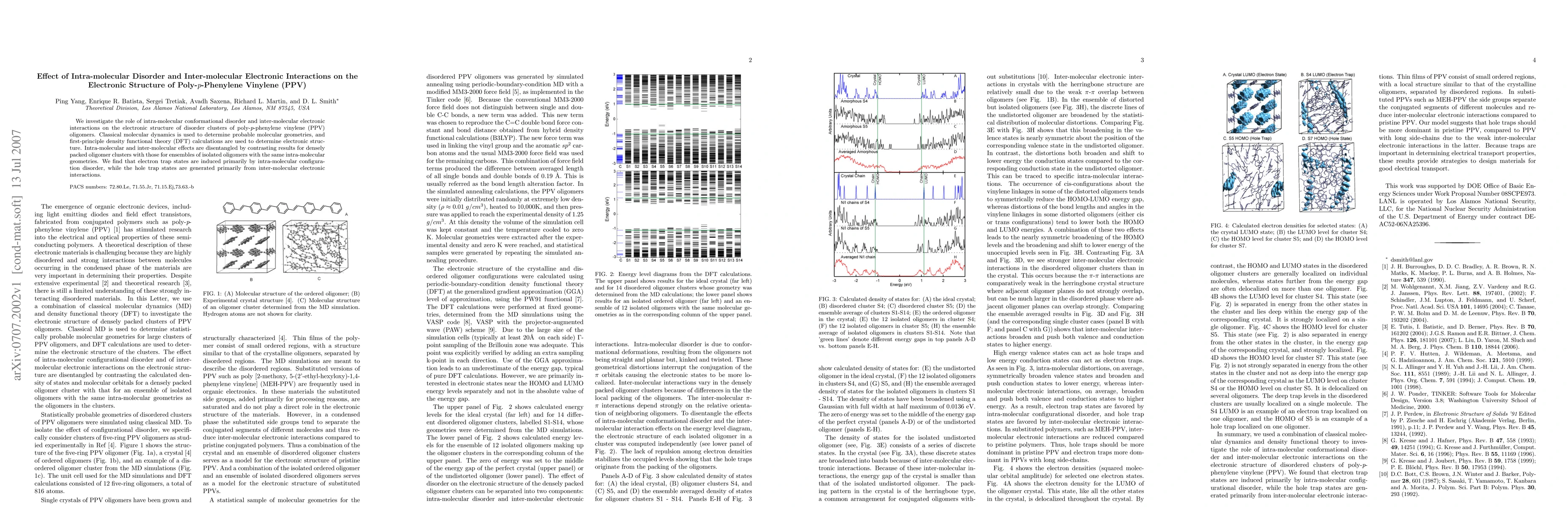 This study uses classical molecular dynamics and DFT to examine how intra-molecular disorder and inter-molecular electronic interactions affect the electronic structure of PPV oligomers. Results show that intra-molecular disorder induces electron trap states, while inter-molecular interactions generate hole trap states.
