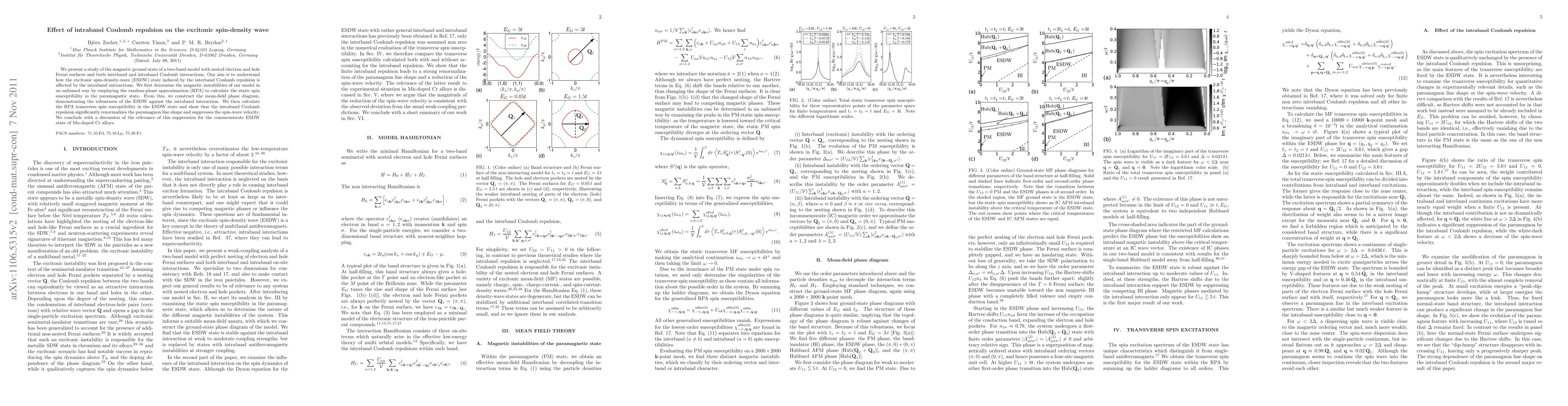 Researchers investigated how intraband Coulomb repulsion affects the magnetic ground state of a two-band model with excitonic spin-density waves, finding that it renormalizes paramagnon line shapes and suppresses spin-wave velocities.