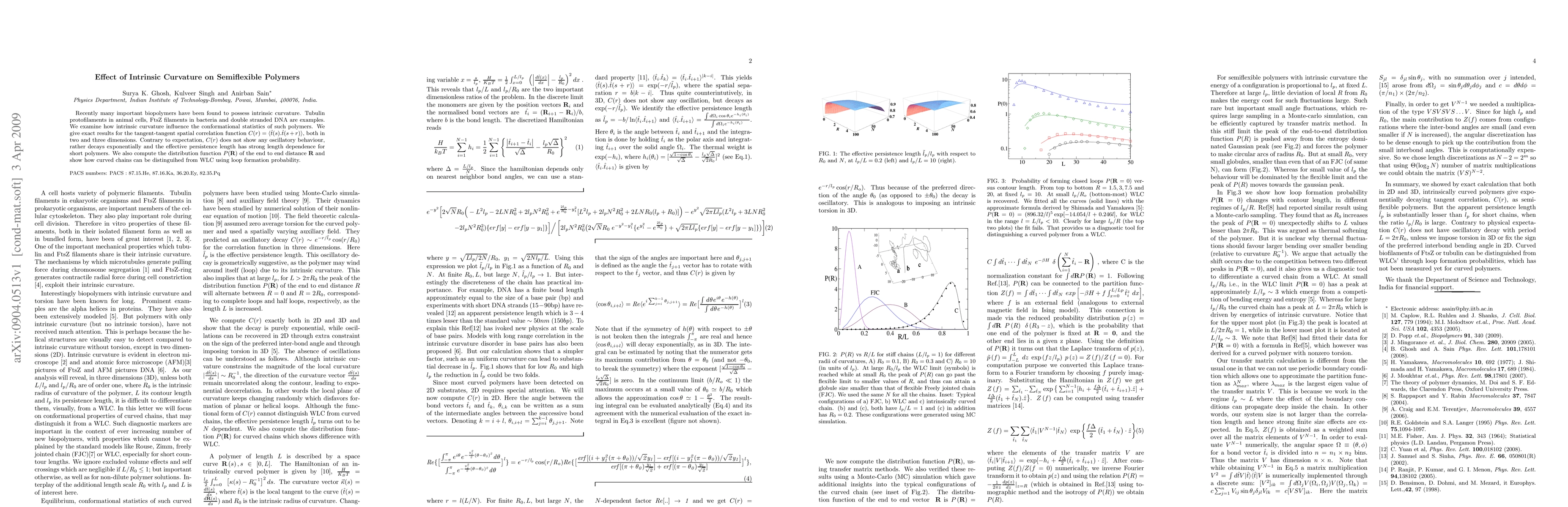 Recently many important biopolymers have been found to possess intrinsic curvature. Tubulin protofilaments in animal cells, FtsZ filaments in bacteria and double stranded DNA are examples. We examine how intrinsic curvature influence the conformational statistics of such polymers. We give exact results for the tangent-tangent spatial correlation function C(r) = t(s).t(s + r), both in two and three dimensions. Contrary to expectation, C(r) does not show any oscillatory behavior, rather decays exponentially and the effective persistence length has strong length dependence for short polymers. We also compute the distribution function P(R) of the end to end distance R and show how curved chains can be distinguihed from WLC using loop formation probability.