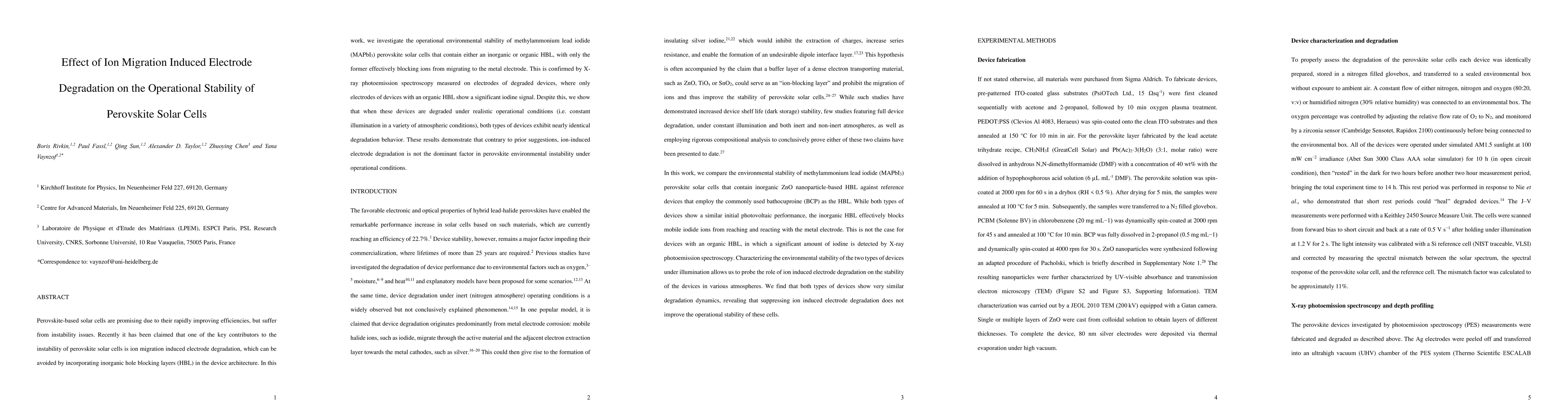 This study investigates the role of ion migration induced electrode degradation in the instability of perovskite solar cells, finding that inorganic hole blocking layers can prevent ion migration but do not significantly affect overall operational stability under realistic conditions. Contrary to previous claims, ion-induced electrode degradation is not the main factor in environmental instability.
