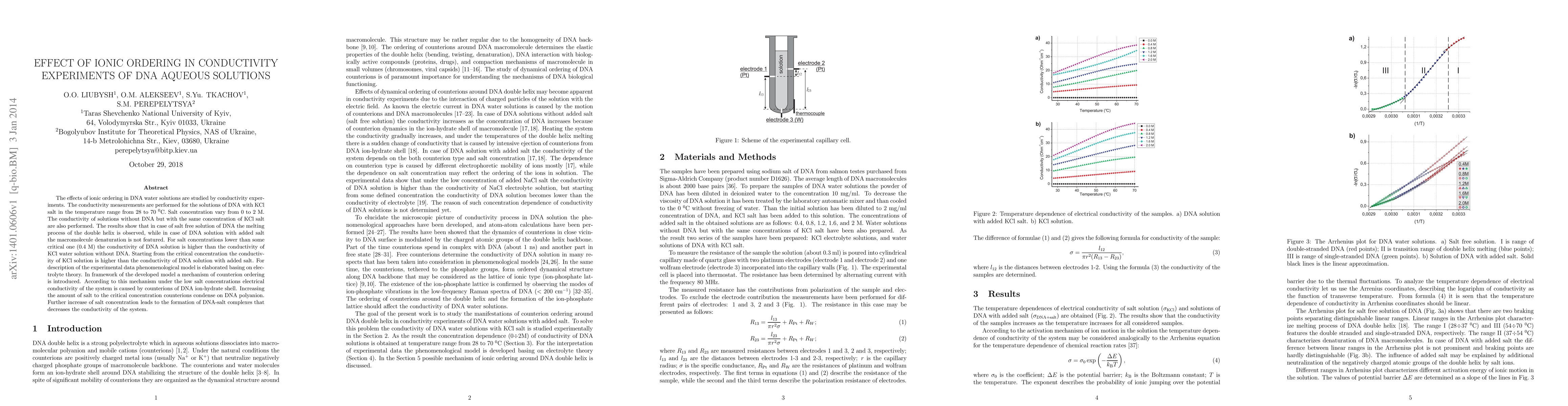The effects of ionic ordering in DNA water solutions are studied by conductivity experiments. The conductivity measurements are performed for the solutions of DNA with KCl salt in the temperature range from 28 to 70 C. Salt concentration vary from 0 to 2 M. The conductivity of solutions without DNA but with the same concentration of KCl salt are also performed. The results show that in case of salt free solution of DNA the melting process of the double helix is observed, while in case of DNA solution with added salt the macromolecule denaturation is not featured. For salt concentrations lower than some critical one (0.4 M) the conductivity of DNA solution is higher than the conductivity of KCl water solution without DNA. Starting from the critical concentration the conductivity of KCl solution is higher than the conductivity of DNA solution with added salt. For description of the experimental data phenomenological model is elaborated basing on electrolyte theory. In framework of the developed model a mechanism of counterion ordering is introduced. According to this mechanism under the low salt concentrations electrical conductivity of the system is caused by counterions of DNA ion-hydrate shell. Increasing the amount of salt to the critical concentration counterions condense on DNA polyanion. Further increase of salt concentration leads to the formation of DNA-salt complexes that decreases the conductivity of the system.
