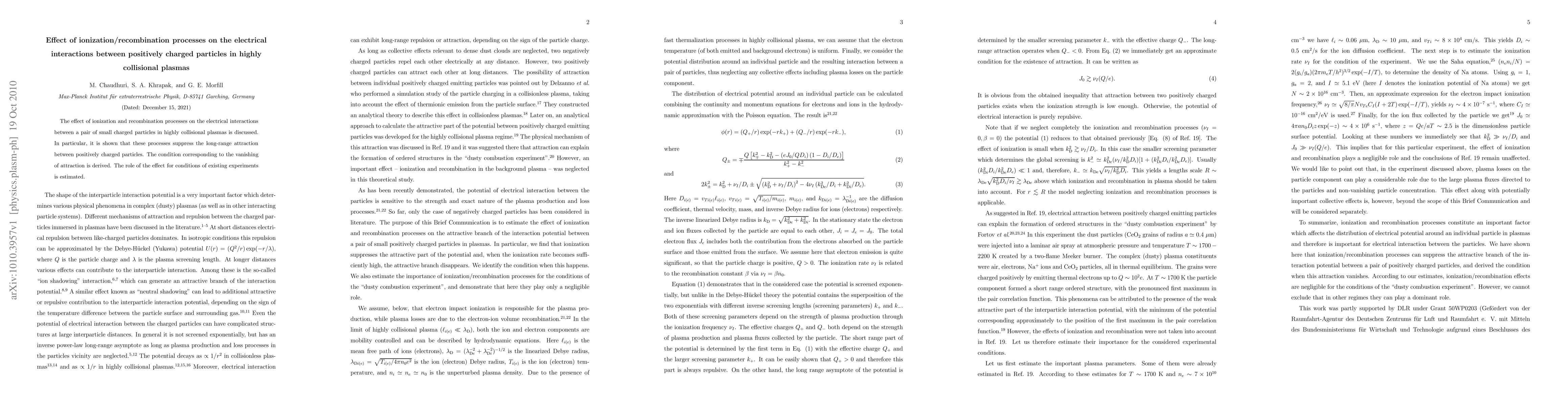This paper explores how ionization and recombination processes in highly collisional plasmas reduce the long-range attraction between positively charged particles, deriving the condition for vanishing attraction and assessing its relevance to current experimental conditions.