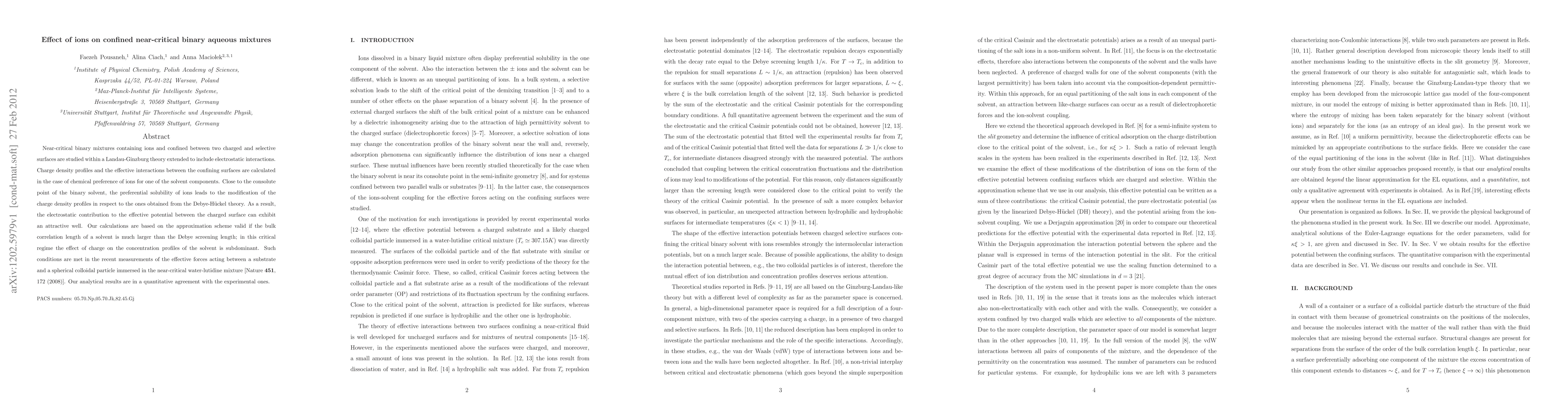 This paper studies the effect of ions on confined near-critical binary aqueous mixtures using an extended Landau-Ginzburg theory, revealing that ion preference modifies charge density profiles and can create an attractive electrostatic potential between surfaces. Analytical results match experimental observations of effective forces in near-critical water-lutidine mixtures.