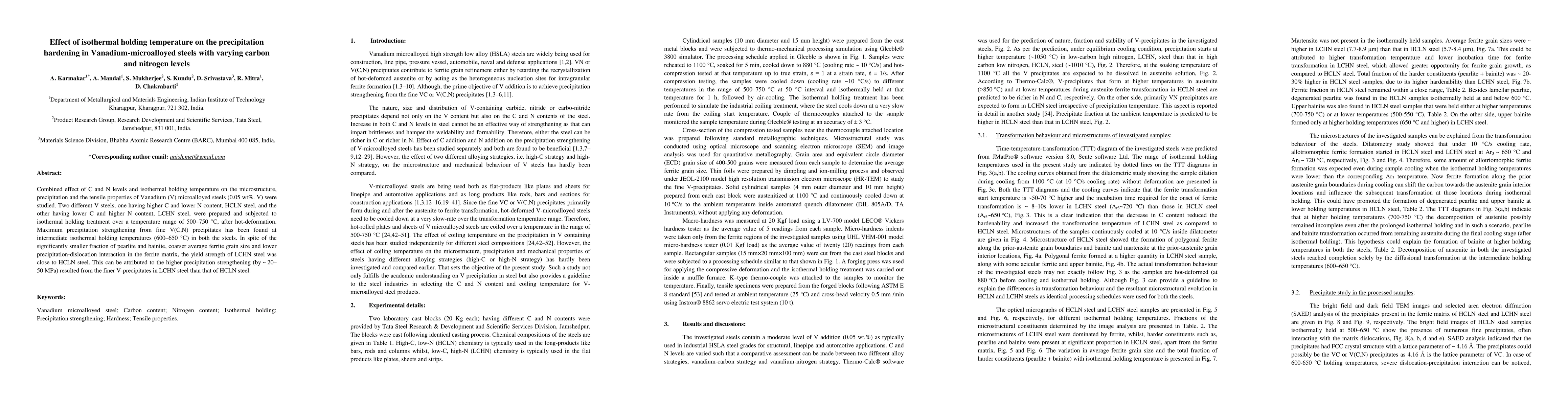 This study investigates the impact of isothermal holding temperature on the precipitation hardening of Vanadium-microalloyed steels with varying carbon and nitrogen levels. Results show that optimal precipitation strengthening occurs at 600-650°C, with LCHN steel achieving higher yield strength despite coarser grains due to finer Vanadium precipitates.