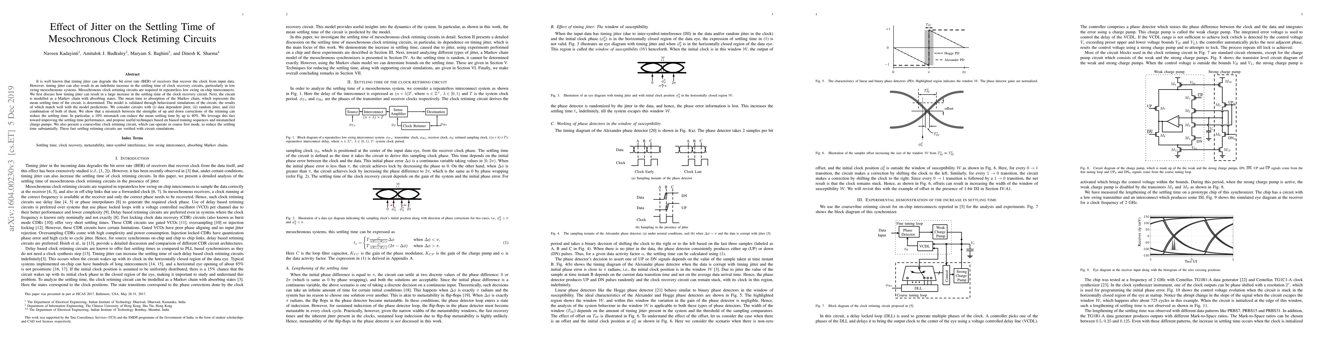 It is well known that timing jitter can degrade the bit error rate (BER) of receivers that recover the clock from input data. However, timing jitter can also result in an indefinite increase in the settling time of clock recovery circuits, particularly in low swing mesochronous systems. Mesochronous clock retiming circuits are required in repeaterless low swing on-chip interconnects. We first discuss how timing jitter can result in a large increase in the settling time of the clock recovery circuit. Next, the circuit is modelled as a Markov chain with absorbing states. The mean time to absorption of the Markov chain, which represents the mean settling time of the circuit, is determined. The model is validated through behavioural simulations of the circuit, the results of which match well with the model predictions. We consider circuits with (i) data dependent jitter, (ii) random jitter, and (iii) combination of both of them. We show that a mismatch between the strengths of up and down corrections of the retiming can reduce the settling time. In particular, a 10% mismatch can reduce the mean settling time by up to 40%. We leverage this fact toward improving the settling time performance, and propose useful techniques based on biased training sequences and mismatched charge pumps. We also present a coarse+fine clock retiming circuit, which can operate in coarse first mode, to reduce the settling time substantially. These fast settling retiming circuits are verified with circuit simulations.