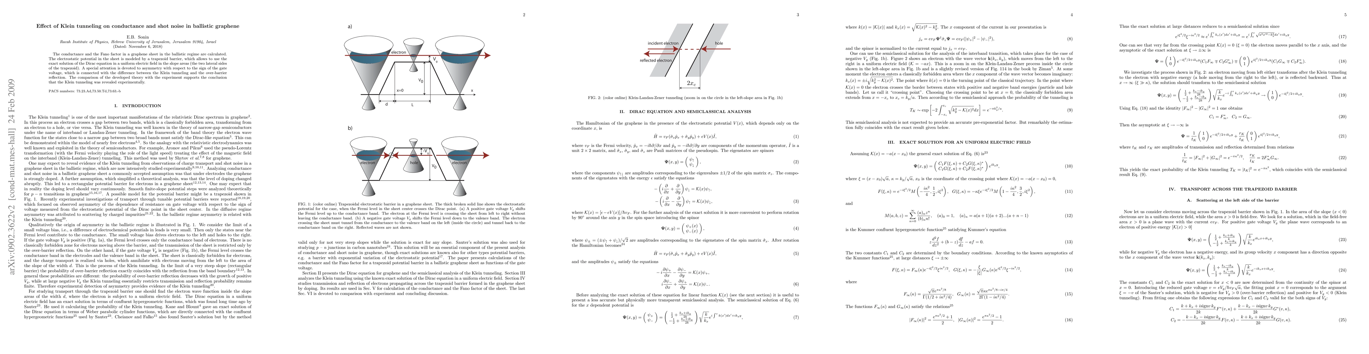 The conductance and the Fano factor in a graphene sheet in the ballistic regime are calculated. The electrostatic potential in the sheet is modeled by a trapezoid barrier, which allows to use the exact solution of the Dirac equation in a uniform electric field in the slope areas (the two lateral sides of the trapezoid). A special attention is devoted to asymmetry with respect to the sign of the gate voltage, which is connected with the difference between the Klein tunneling and the over-barrier reflection. The comparison of the developed theory with the experiment supports the conclusion that the Klein tunneling was revealed experimentally.
