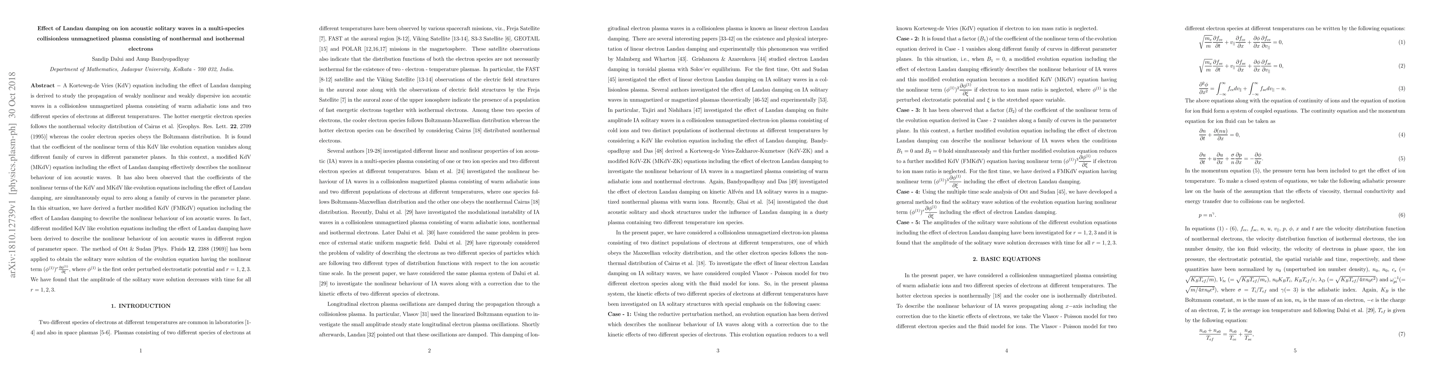 This paper derives modified Korteweg-de Vries (KdV) equations to study the effect of Landau damping on ion acoustic solitary waves in a multi-species collisionless plasma. It finds that different modified KdV equations are needed to describe the nonlinear behavior in various regions of parameter space, with the amplitude of solitary waves decreasing over time.