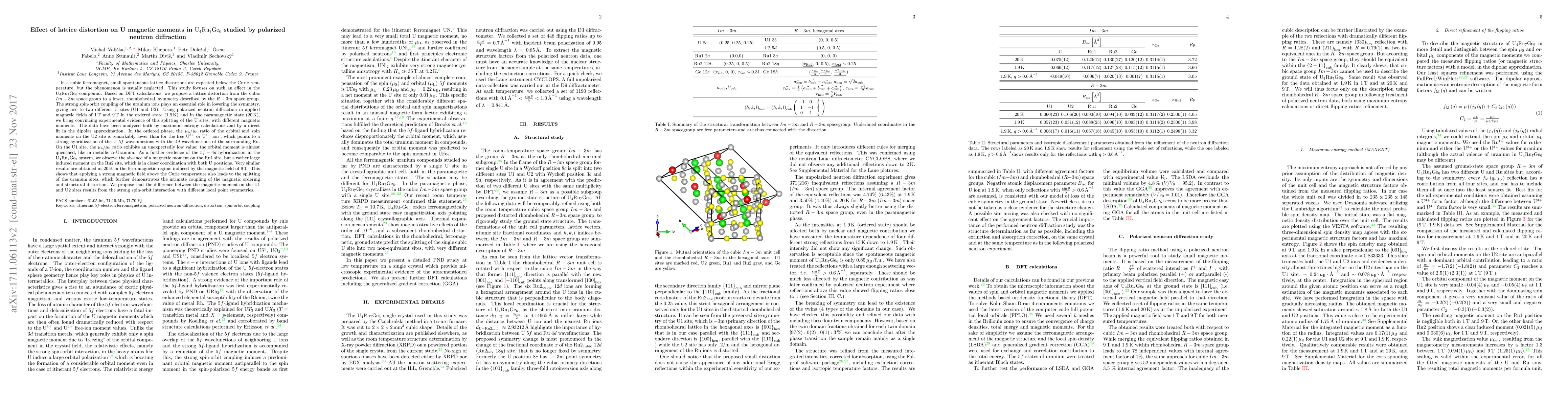 Small spontaneous lattice distortion of a cubic ferromagnet at temperatures below $T_{\mathrm{C}}$ is expected, but usually a neglected phenomenon. This study is focused on such effect on the example of $\mathrm{U_{4}Ru_{7}Ge_{6}}$. We propose the lattice distortion from the cubic space group to a lower symmetry as a result of our DFT calculations. The strong spin-orbit coupling on the U site plays the most essential role, that should lower the symmetry of the system and give rise to the two different U sites (U1 and U2). We bring convincing experimental evidence for this splitting resulting from our polarized neutron diffraction experiment. Proper treatment of the flipping ratios collected in the ordered state and in the paramagnetic state reveals dramatically different magnetic moments on the U1 and U2 sites. We have reached good agreement of the results from the MAXENT method and from direct fitting of the data. The ratio of the orbital and spin component on the U2 site is lower than for the free $\mathrm{U^{3+}}$ or $\mathrm{U^{4+}}$ ion and points to a strong hybridization between the U $5f$ and Ru $4d$ wave functions. The same ratio on the U1 site is unexpectedly low. This would mean that its orbital component is almost quenched. We have observed the absence of a magnetic moment on the Ru1 site, but a rather large induced moment on the Ru2 site. Very similar results were obtained also in the paramagnetic state in the regime induced by the magnetic field. It points to the intimate coupling of the magnetic ordering and structural distortion as it is possible to split the U site in to two different polarizing paramagnetic U moments above $T_{\mathrm{C}}$ by a strong magnetic field. We propose that the difference between the magnetic moment on the U sites is caused by the change of local point symmetry of the sites that is tightly bound to the role of the strong spin-orbit interaction.